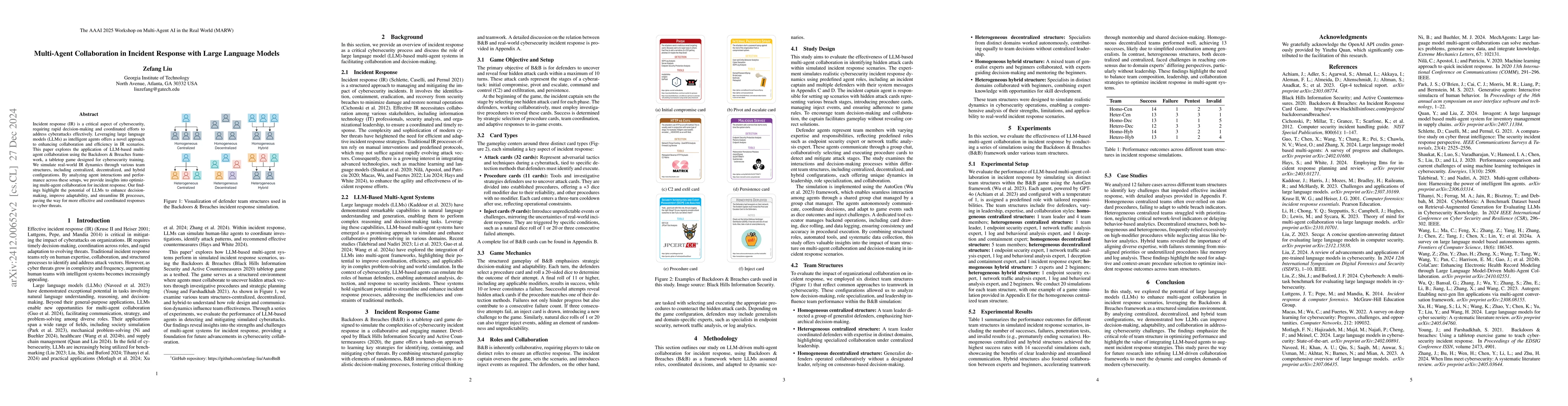 This paper investigates the use of large language models (LLMs) in multi-agent collaboration for incident response, utilizing the Backdoors & Breaches framework. It evaluates various team structures to optimize collaboration, revealing LLMs' potential to enhance decision-making and streamline cybersecurity responses.