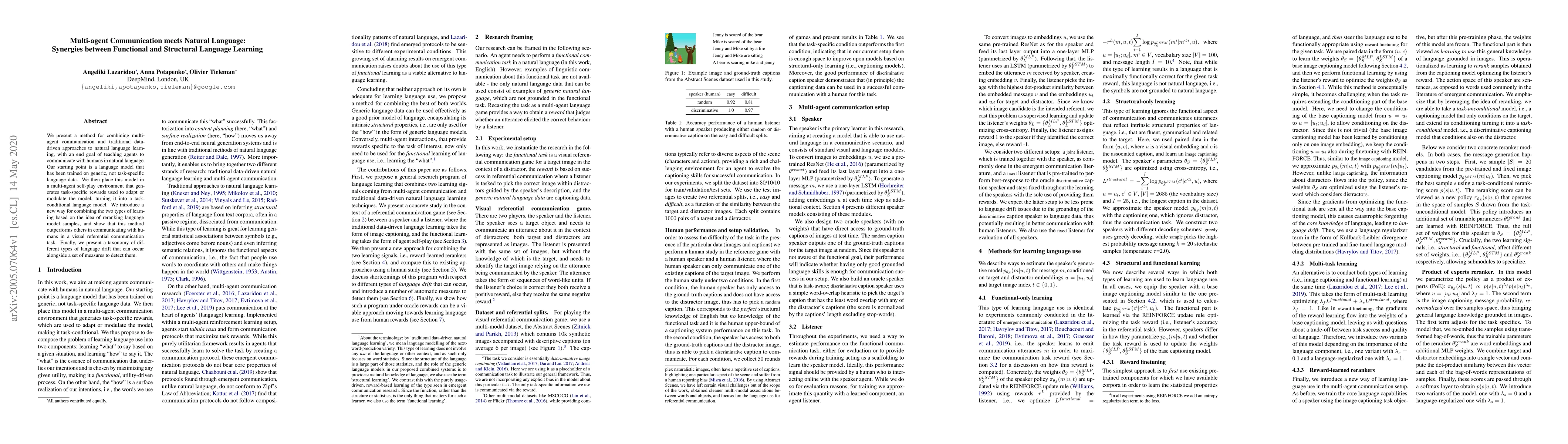 This paper combines multi-agent communication with traditional natural language learning to teach agents to communicate in natural language. It introduces a method for reranking language model samples that outperforms others in a visual referential task, and presents a taxonomy of language drift with detection measures.