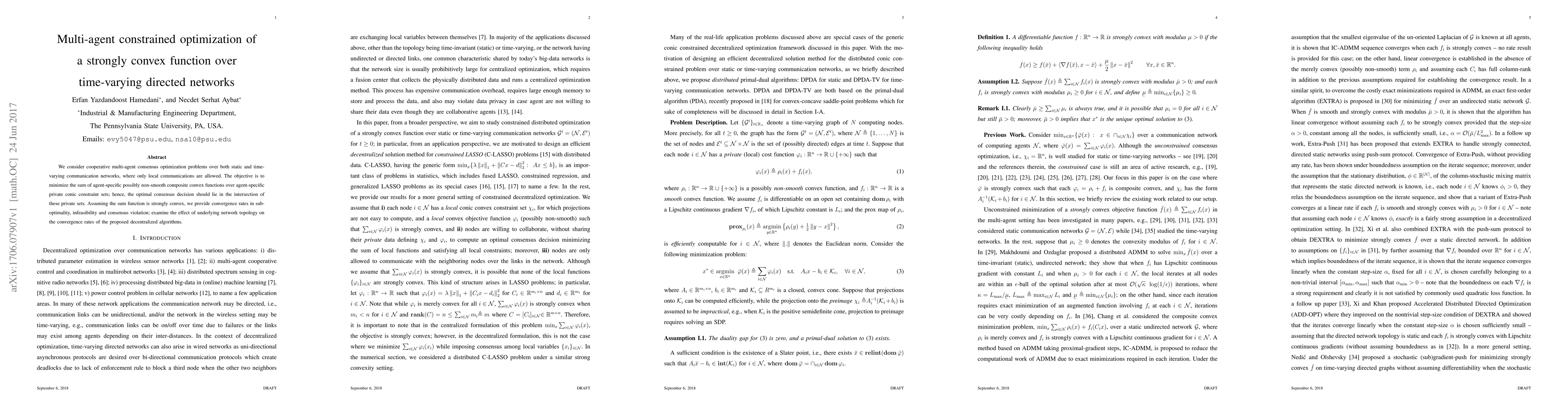 We consider cooperative multi-agent consensus optimization problems over both static and time-varying communication networks, where only local communications are allowed. The objective is to minimize the sum of agent-specific possibly non-smooth composite convex functions over agent-specific private conic constraint sets; hence, the optimal consensus decision should lie in the intersection of these private sets. Assuming the sum function is strongly convex, we provide convergence rates in suboptimality, infeasibility and consensus violation; examine the effect of underlying network topology on the convergence rates of the proposed decentralized algorithms.