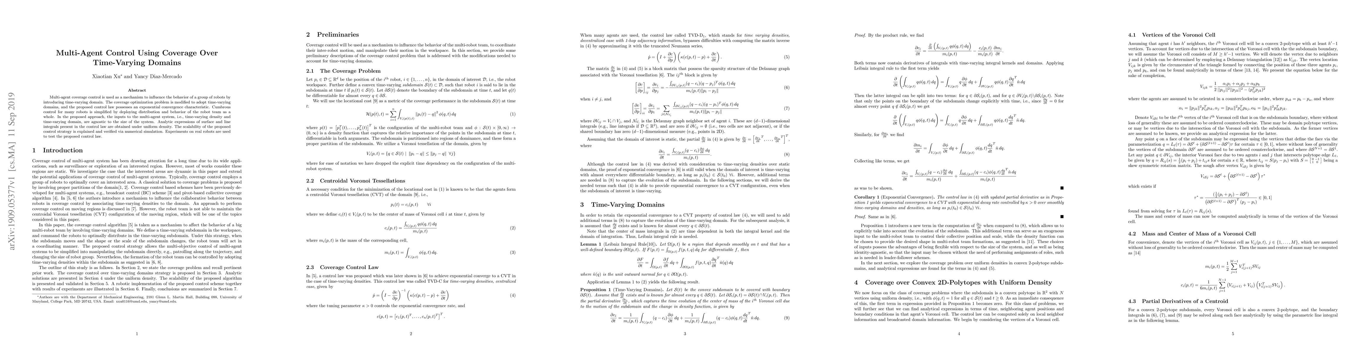 This paper proposes a scalable multi-agent control law for coverage over time-varying domains, ensuring exponential convergence and simplifying control for large robot teams. The approach is validated through both numerical simulations and real-robot experiments.