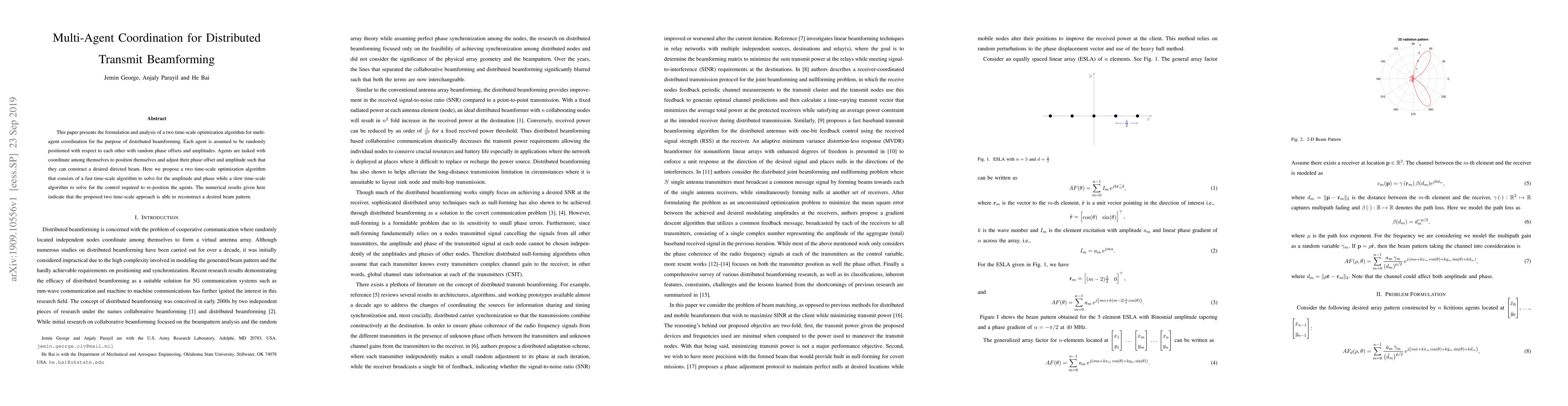 A two-time-scale optimization algorithm is proposed for multi-agent coordination to achieve distributed beamforming, successfully reconstructing desired beam patterns in numerical results.