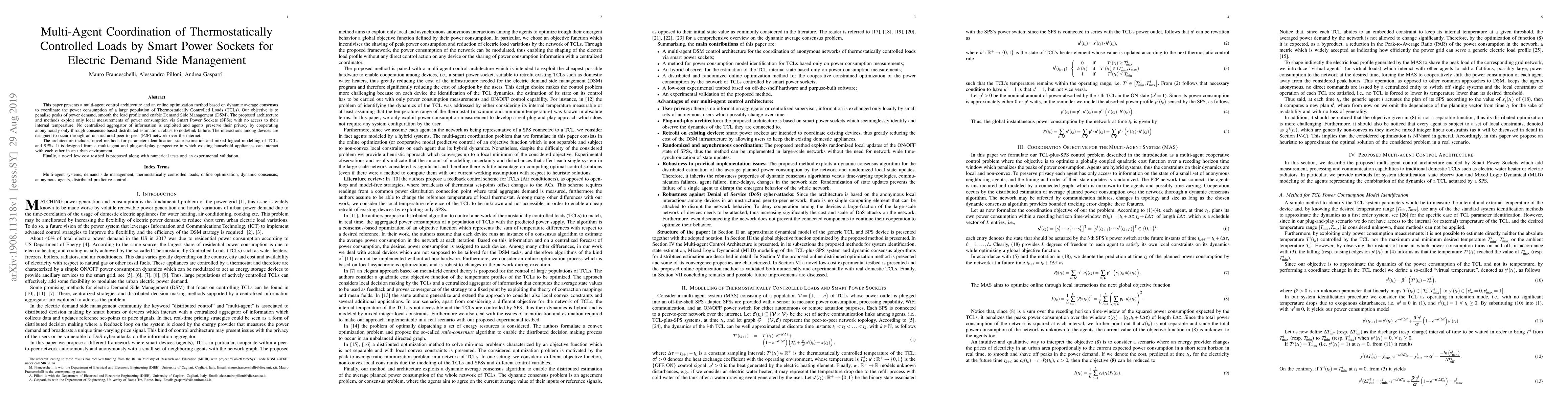 This paper proposes a multi-agent control architecture for coordinating thermostatically controlled loads via smart power sockets to manage electric demand. The approach uses distributed consensus methods to smooth power demand peaks without central data collection, ensuring privacy and robustness against failures.