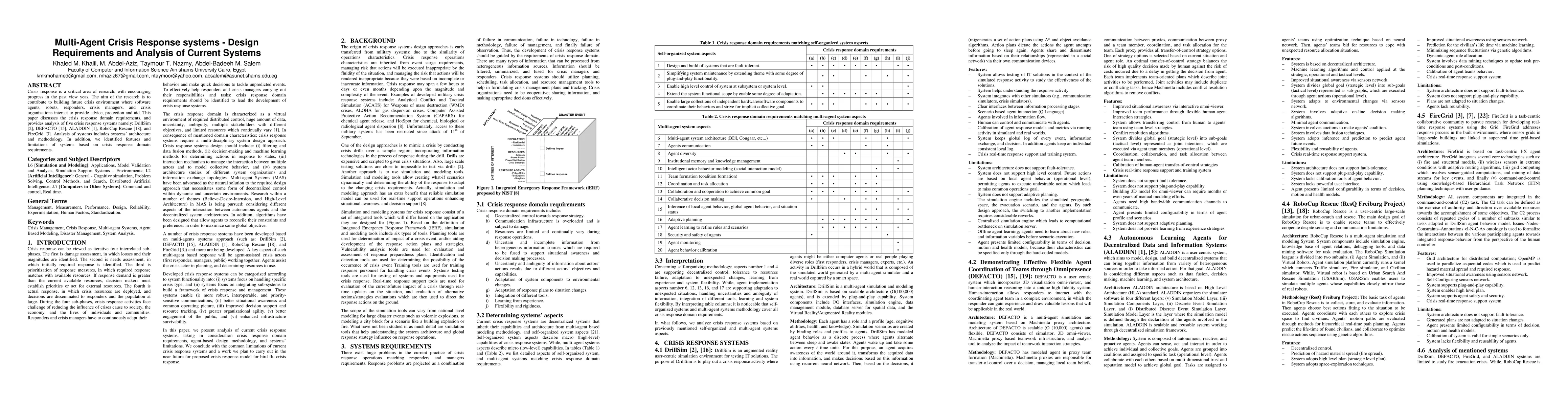This research discusses crisis response domain requirements and analyzes five crisis response systems: DrillSim, DEFACTO, ALADDIN, RoboCup Rescue, and FireGrid. The analysis includes systems architecture and methodology, identifying features and limitations based on crisis response domain requirements.