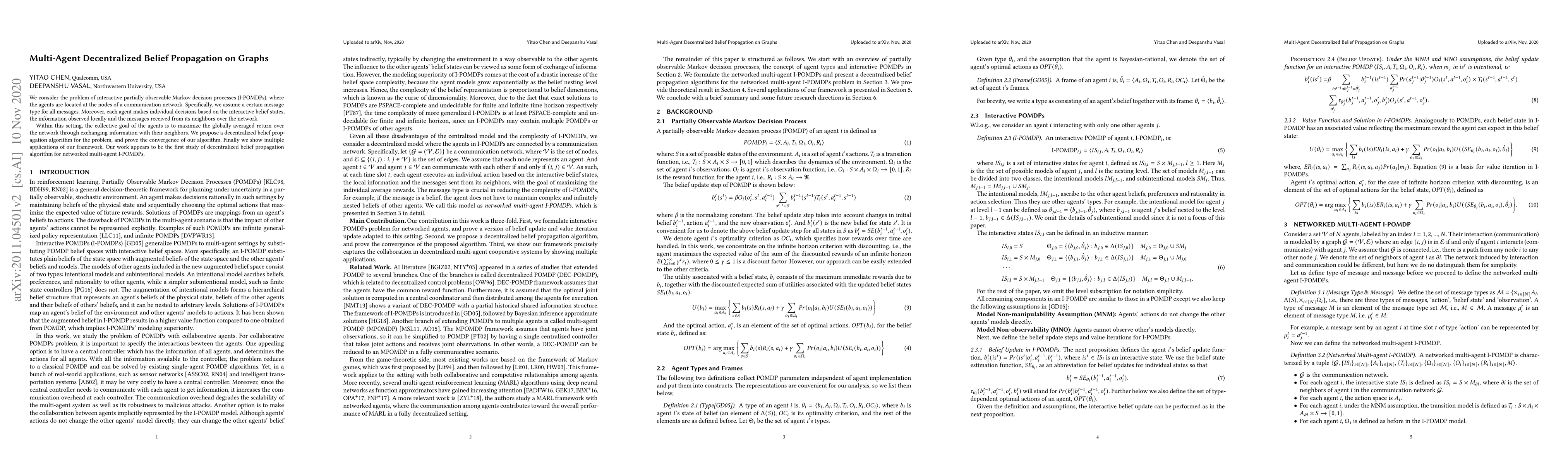 We consider the problem of interactive partially observable Markov decision processes (I-POMDPs), where the agents are located at the nodes of a communication network. Specifically, we assume a certain message type for all messages. Moreover, each agent makes individual decisions based on the interactive belief states, the information observed locally and the messages received from its neighbors over the network. Within this setting, the collective goal of the agents is to maximize the globally averaged return over the network through exchanging information with their neighbors. We propose a decentralized belief propagation algorithm for the problem, and prove the convergence of our algorithm. Finally we show multiple applications of our framework. Our work appears to be the first study of decentralized belief propagation algorithm for networked multi-agent I-POMDPs.