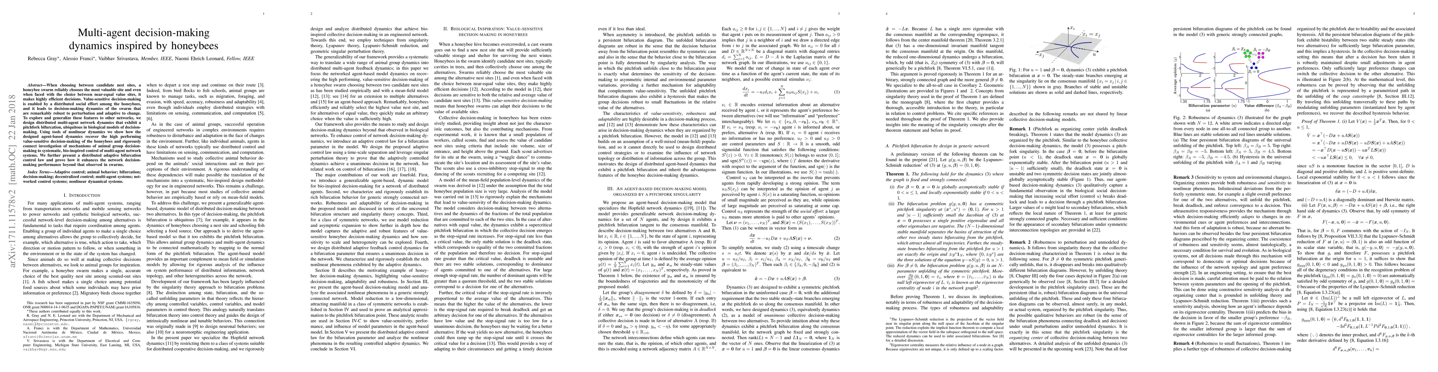 This paper explores multi-agent decision-making dynamics inspired by honeybee swarms, demonstrating how distributed social effort leads to robust and adaptive decision-making. It introduces a distributed adaptive bifurcation control law to enhance network decision-making performance, connecting biological decision-making mechanisms to bio-inspired control of multi-agent systems.