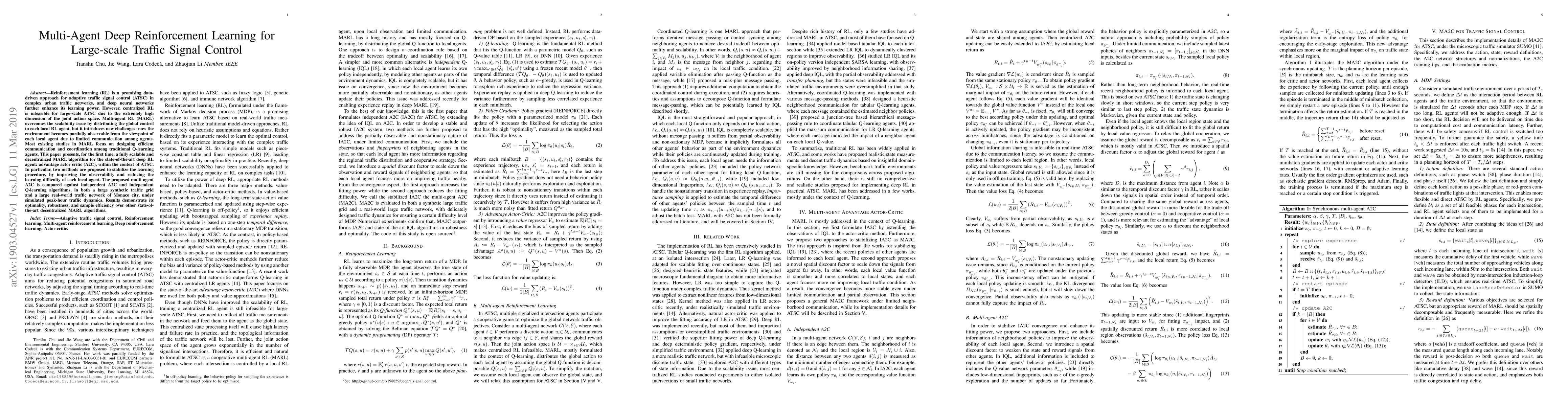 This paper proposes a scalable, decentralized multi-agent deep reinforcement learning algorithm based on A2C for adaptive traffic signal control in large urban networks. It addresses the scalability issue by distributing control among local agents, while introducing methods to improve observability and stabilize learning. The proposed approach outperforms independent A2C and Q-learning in both synthetic and real-world traffic simulations.