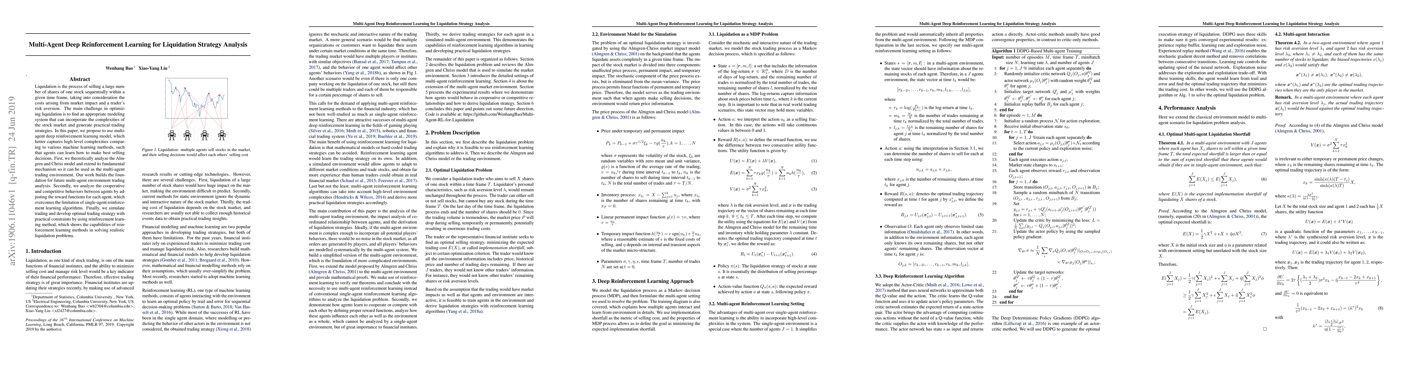 Liquidation is the process of selling a large number of shares of one stock sequentially within a given time frame, taking into consideration the costs arising from market impact and a trader's risk aversion. The main challenge in optimizing liquidation is to find an appropriate modeling system that can incorporate the complexities of the stock market and generate practical trading strategies. In this paper, we propose to use multi-agent deep reinforcement learning model, which better captures high-level complexities comparing to various machine learning methods, such that agents can learn how to make the best selling decisions. First, we theoretically analyze the Almgren and Chriss model and extend its fundamental mechanism so it can be used as the multi-agent trading environment. Our work builds the foundation for future multi-agent environment trading analysis. Secondly, we analyze the cooperative and competitive behaviours between agents by adjusting the reward functions for each agent, which overcomes the limitation of single-agent reinforcement learning algorithms. Finally, we simulate trading and develop an optimal trading strategy with practical constraints by using a reinforcement learning method, which shows the capabilities of reinforcement learning methods in solving realistic liquidation problems.