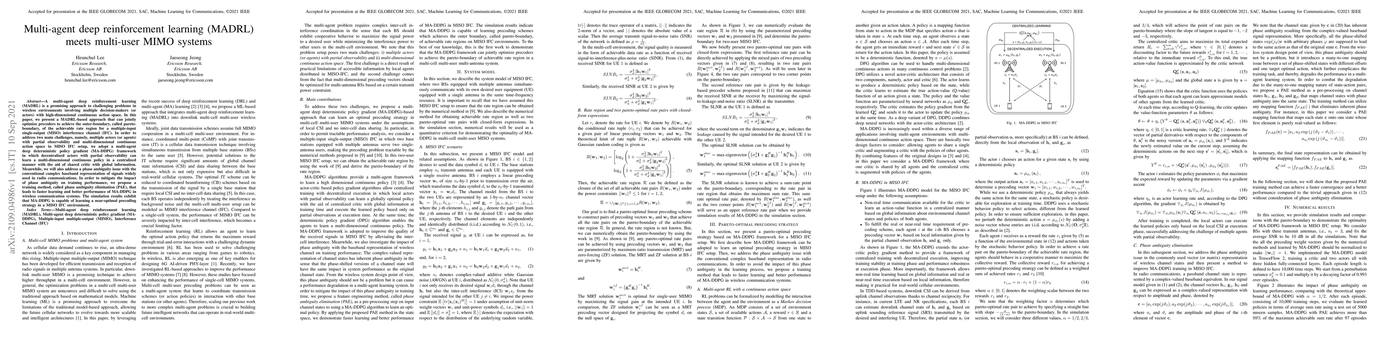 A multi-agent deep reinforcement learning (MADRL) is a promising approach to challenging problems in wireless environments involving multiple decision-makers (or actors) with high-dimensional continuous action space. In this paper, we present a MADRL-based approach that can jointly optimize precoders to achieve the outer-boundary, called pareto-boundary, of the achievable rate region for a multiple-input single-output (MISO) interference channel (IFC). In order to address two main challenges, namely, multiple actors (or agents) with partial observability and multi-dimensional continuous action space in MISO IFC setup, we adopt a multi-agent deep deterministic policy gradient (MA-DDPG) framework in which decentralized actors with partial observability can learn a multi-dimensional continuous policy in a centralized manner with the aid of shared critic with global information. Meanwhile, we will also address a phase ambiguity issue with the conventional complex baseband representation of signals widely used in radio communications. In order to mitigate the impact of phase ambiguity on training performance, we propose a training method, called phase ambiguity elimination (PAE), that leads to faster learning and better performance of MA-DDPG in wireless communication systems. The simulation results exhibit that MA-DDPG is capable of learning a near-optimal precoding strategy in a MISO IFC environment. To the best of our knowledge, this is the first work to demonstrate that the MA-DDPG framework can jointly optimize precoders to achieve the pareto-boundary of achievable rate region in a multi-cell multi-user multi-antenna system.
