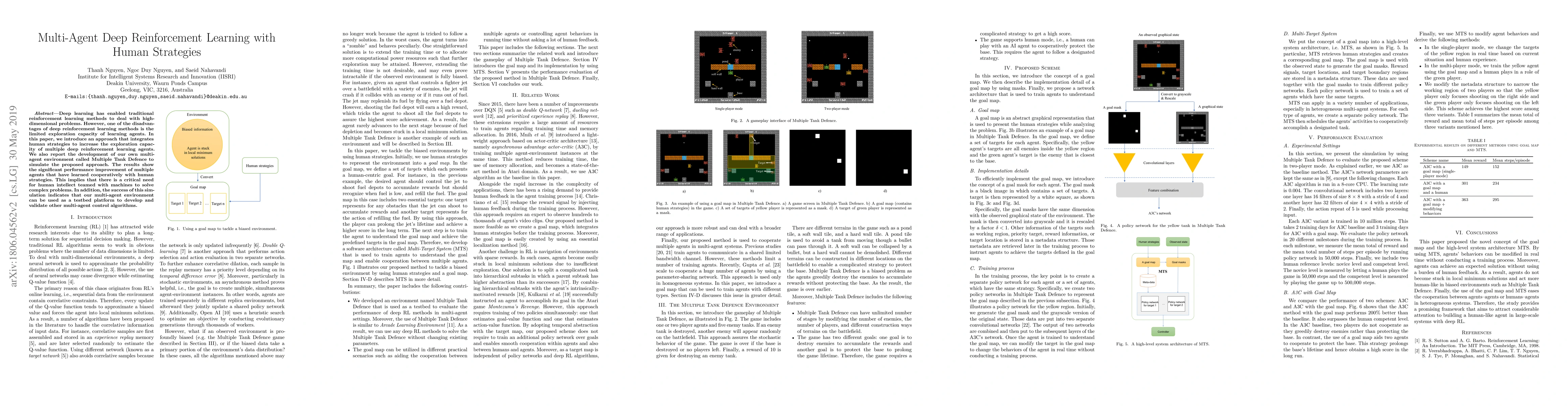 Deep learning has enabled traditional reinforcement learning methods to deal with high-dimensional problems. However, one of the disadvantages of deep reinforcement learning methods is the limited exploration capacity of learning agents. In this paper, we introduce an approach that integrates human strategies to increase the exploration capacity of multiple deep reinforcement learning agents. We also report the development of our own multi-agent environment called Multiple Tank Defence to simulate the proposed approach. The results show the significant performance improvement of multiple agents that have learned cooperatively with human strategies. This implies that there is a critical need for human intellect teamed with machines to solve complex problems. In addition, the success of this simulation indicates that our multi-agent environment can be used as a testbed platform to develop and validate other multi-agent control algorithms.