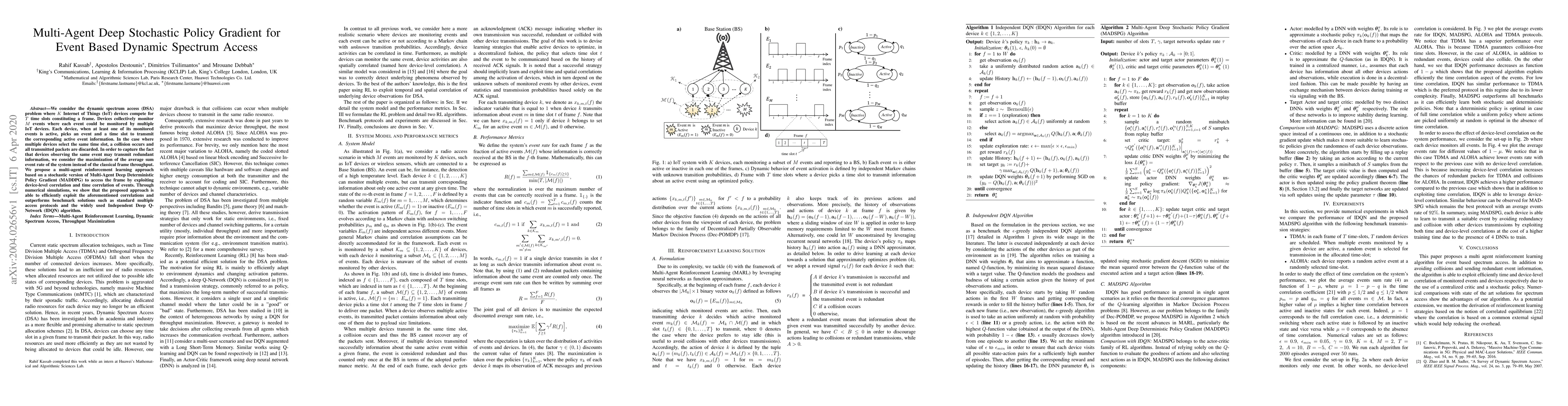 We consider the dynamic spectrum access (DSA) problem where $K$ Internet of Things (IoT) devices compete for $T$ time slots constituting a frame. Devices collectively monitor $M$ events where each event could be monitored by multiple IoT devices. Each device, when at least one of its monitored events is active, picks an event and a time slot to transmit the corresponding active event information. In the case where multiple devices select the same time slot, a collision occurs and all transmitted packets are discarded. In order to capture the fact that devices observing the same event may transmit redundant information, we consider the maximization of the average sum event rate of the system instead of the classical frame throughput. We propose a multi-agent reinforcement learning approach based on a stochastic version of Multi-Agent Deep Deterministic Policy Gradient (MADDPG) to access the frame by exploiting device-level correlation and time correlation of events. Through numerical simulations, we show that the proposed approach is able to efficiently exploit the aforementioned correlations and outperforms benchmark solutions such as standard multiple access protocols and the widely used Independent Deep Q-Network (IDQN) algorithm.
