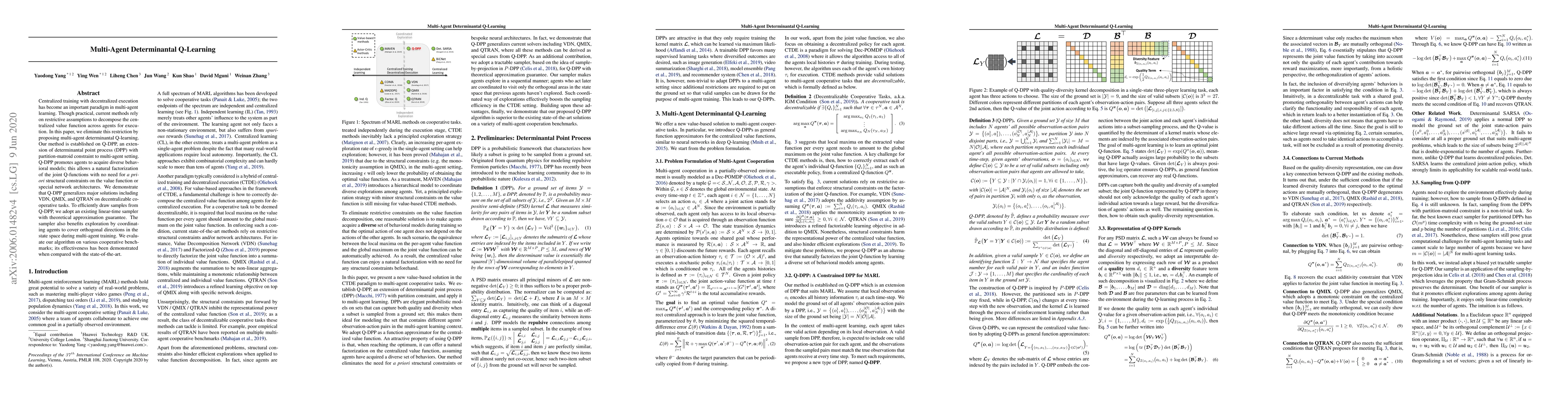 Centralized training with decentralized execution has become an important paradigm in multi-agent learning. Though practical, current methods rely on restrictive assumptions to decompose the centralized value function across agents for execution. In this paper, we eliminate this restriction by proposing multi-agent determinantal Q-learning. Our method is established on Q-DPP, an extension of determinantal point process (DPP) with partition-matroid constraint to multi-agent setting. Q-DPP promotes agents to acquire diverse behavioral models; this allows a natural factorization of the joint Q-functions with no need for \emph{a priori} structural constraints on the value function or special network architectures. We demonstrate that Q-DPP generalizes major solutions including VDN, QMIX, and QTRAN on decentralizable cooperative tasks. To efficiently draw samples from Q-DPP, we adopt an existing sample-by-projection sampler with theoretical approximation guarantee. The sampler also benefits exploration by coordinating agents to cover orthogonal directions in the state space during multi-agent training. We evaluate our algorithm on various cooperative benchmarks; its effectiveness has been demonstrated when compared with the state-of-the-art.