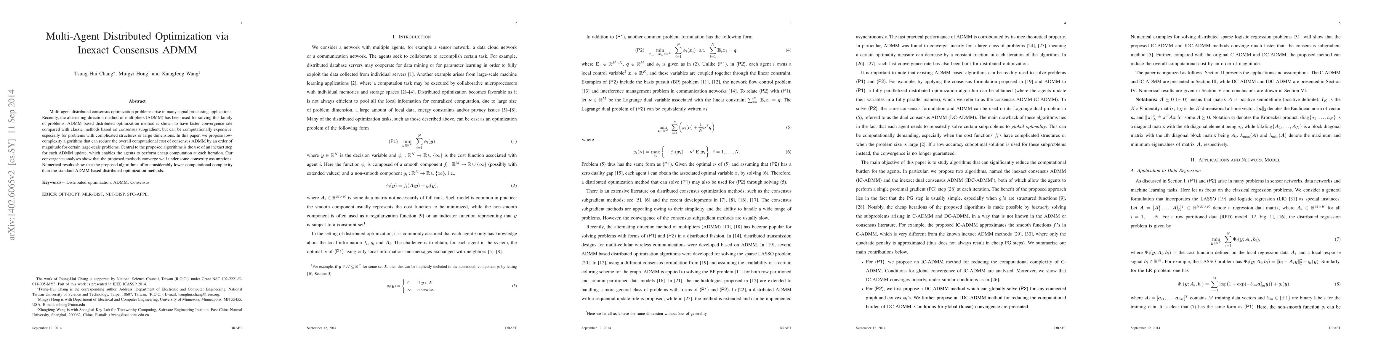 This paper proposes low-complexity algorithms for multi-agent distributed optimization using inexact consensus ADMM, achieving an order of magnitude reduction in computational cost compared to standard ADMM methods while maintaining convergence under convexity assumptions. The inexact step in each ADMM update allows agents to perform cheaper computations.