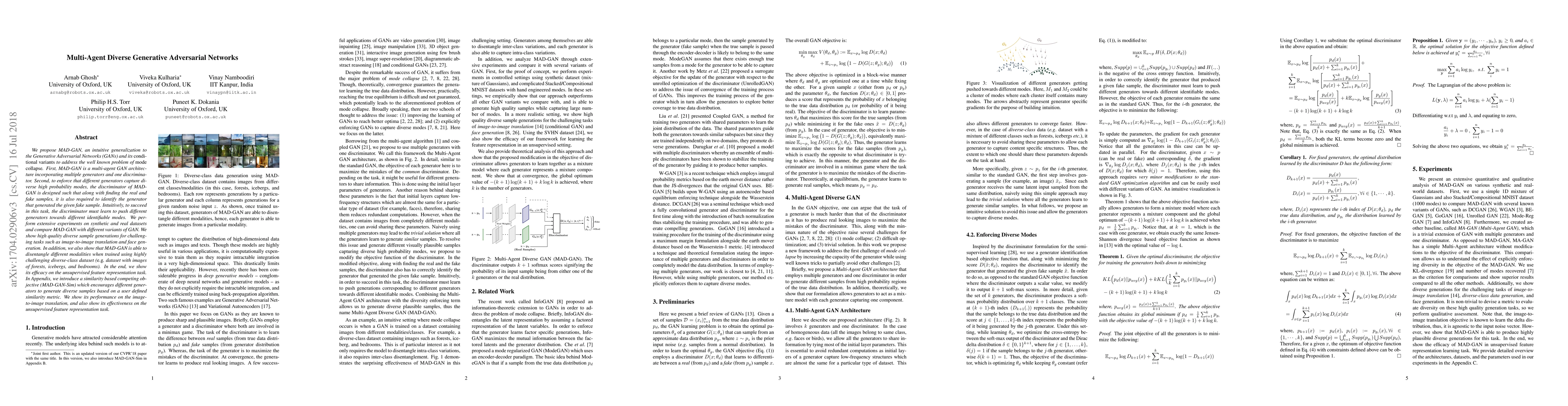 MAD-GAN introduces a multi-agent GAN architecture to mitigate mode collapse by employing multiple generators and a discriminator that identifies the generator of each fake sample, promoting diverse high probability modes. Experiments demonstrate its effectiveness in generating diverse samples for tasks like image-to-image translation and feature representation.