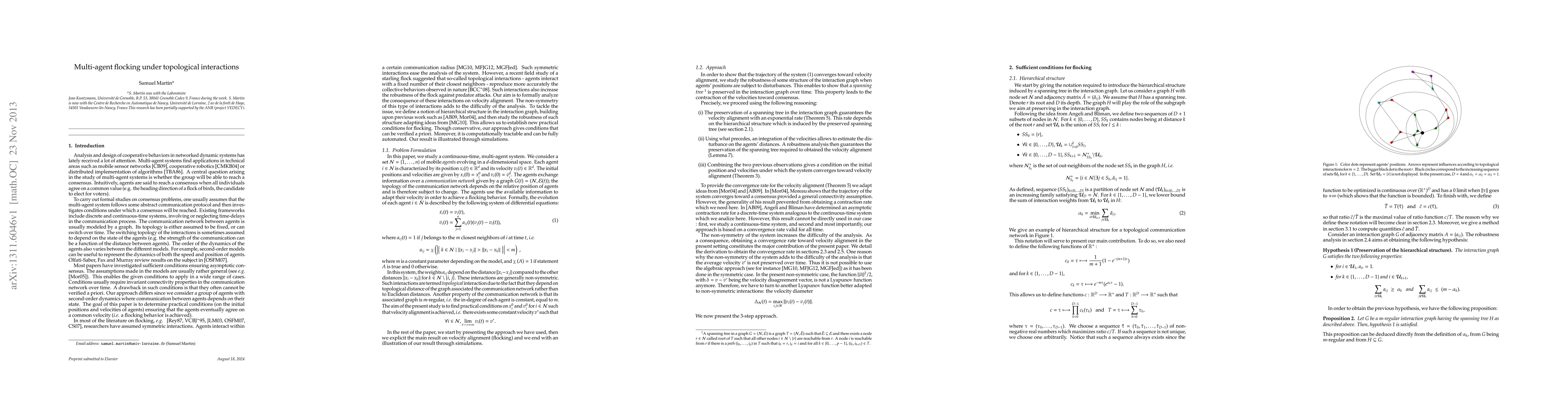 This paper investigates conditions for multi-agent flocking in a system with second-order dynamics, where agents interact with a fixed number of neighbors based on a topological interaction rule. The authors establish practical conditions ensuring agents asymptotically agree on a common velocity, leveraging a hierarchical structure in the interaction graph, and validate their findings through simulations.