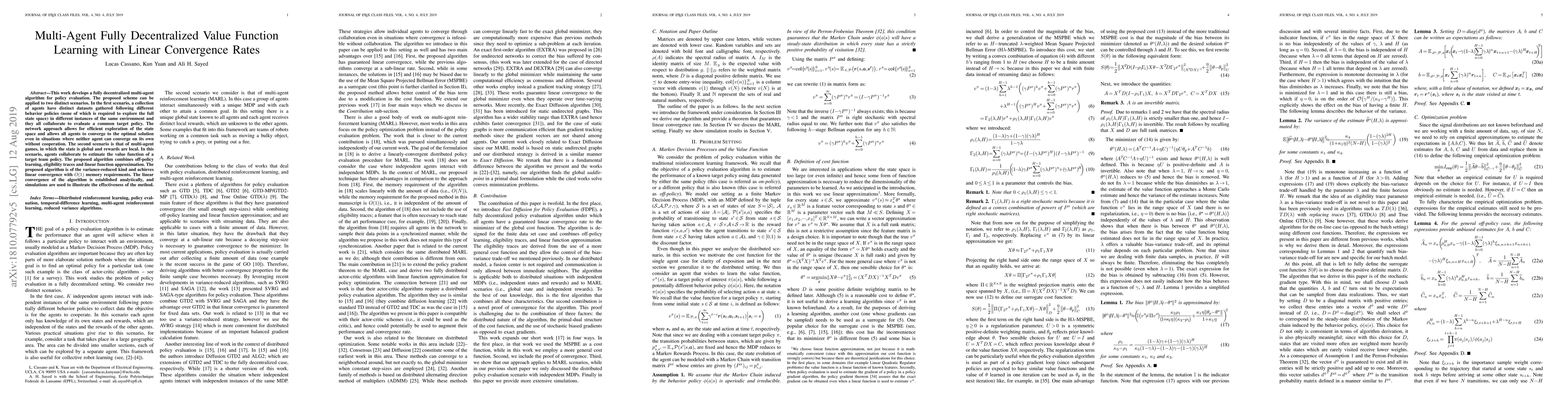 This paper proposes a decentralized multi-agent algorithm for policy evaluation with linear convergence rates, enabling efficient exploration of state spaces and optimal solution convergence in both cooperative and competitive scenarios.