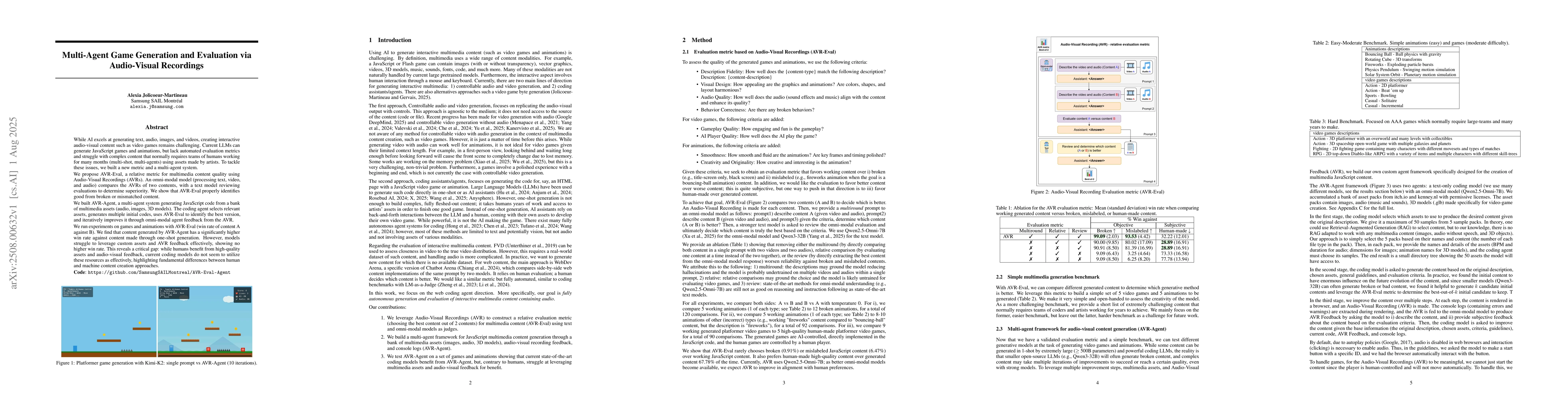 While AI excels at generating text, audio, images, and videos, creating interactive audio-visual content such as video games remains challenging. Current LLMs can generate JavaScript games and animations, but lack automated evaluation metrics and struggle with complex content that normally requires teams of humans working for many months (multi-shot, multi-agents) using assets made by artists. To tackle these issues, we built a new metric and a multi-agent system. We propose AVR-Eval, a relative metric for multimedia content quality using Audio-Visual Recordings (AVRs). An omni-modal model (processing text, video, and audio) compares the AVRs of two contents, with a text model reviewing evaluations to determine superiority. We show that AVR-Eval properly identifies good from broken or mismatched content. We built AVR-Agent, a multi-agent system generating JavaScript code from a bank of multimedia assets (audio, images, 3D models). The coding agent selects relevant assets, generates multiple initial codes, uses AVR-Eval to identify the best version, and iteratively improves it through omni-modal agent feedback from the AVR. We run experiments on games and animations with AVR-Eval (win rate of content A against B). We find that content generated by AVR-Agent has a significantly higher win rate against content made through one-shot generation. However, models struggle to leverage custom assets and AVR feedback effectively, showing no higher win rate. This reveals a critical gap: while humans benefit from high-quality assets and audio-visual feedback, current coding models do not seem to utilize these resources as effectively, highlighting fundamental differences between human and machine content creation approaches.