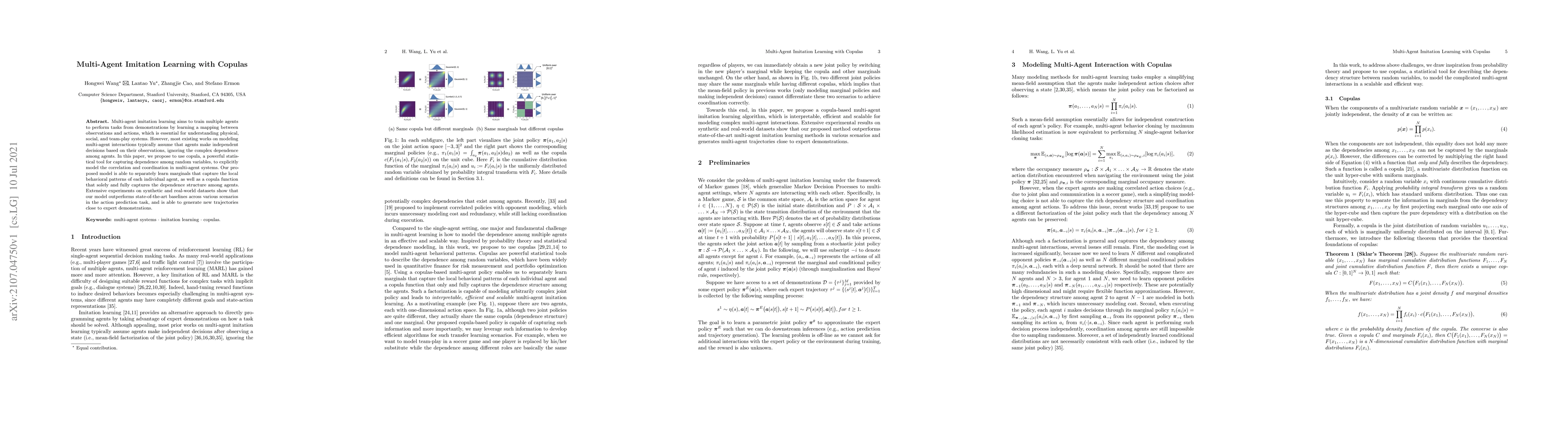 This paper proposes a new approach to multi-agent imitation learning using copula, which outperforms state-of-the-art baselines in action prediction tasks on both synthetic and real-world datasets.