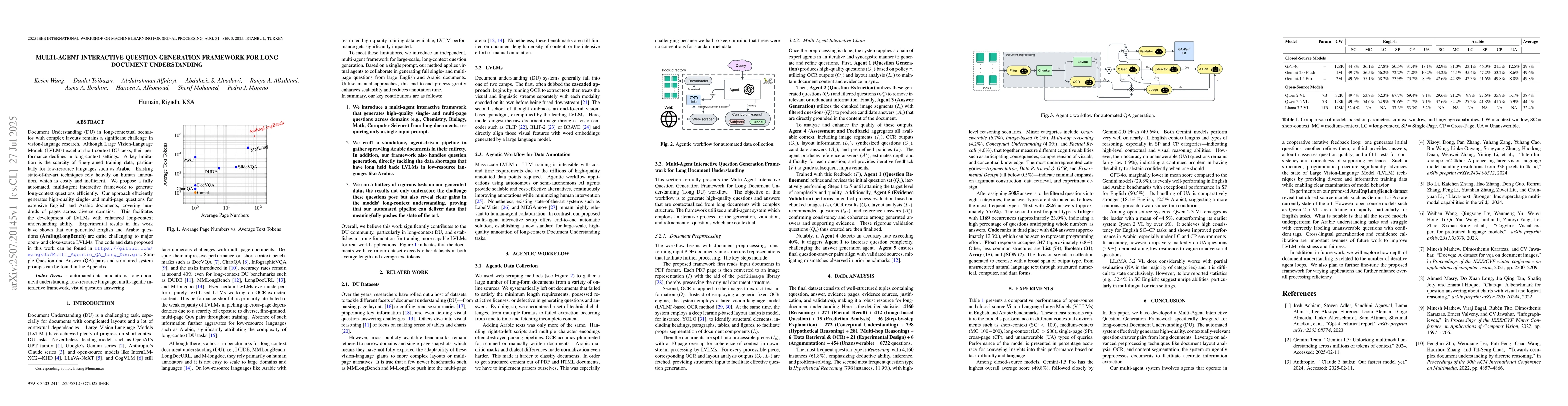 Document Understanding (DU) in long-contextual scenarios with complex layouts remains a significant challenge in vision-language research. Although Large Vision-Language Models (LVLMs) excel at short-context DU tasks, their performance declines in long-context settings. A key limitation is the scarcity of fine-grained training data, particularly for low-resource languages such as Arabic. Existing state-of-the-art techniques rely heavily on human annotation, which is costly and inefficient. We propose a fully automated, multi-agent interactive framework to generate long-context questions efficiently. Our approach efficiently generates high-quality single- and multi-page questions for extensive English and Arabic documents, covering hundreds of pages across diverse domains. This facilitates the development of LVLMs with enhanced long-context understanding ability. Experimental results in this work have shown that our generated English and Arabic questions (\textbf{AraEngLongBench}) are quite challenging to major open- and close-source LVLMs. The code and data proposed in this work can be found in https://github.com/wangk0b/Multi_Agentic_QA_Long_Doc.git. Sample Question and Answer (QA) pairs and structured system prompts can be found in the Appendix.