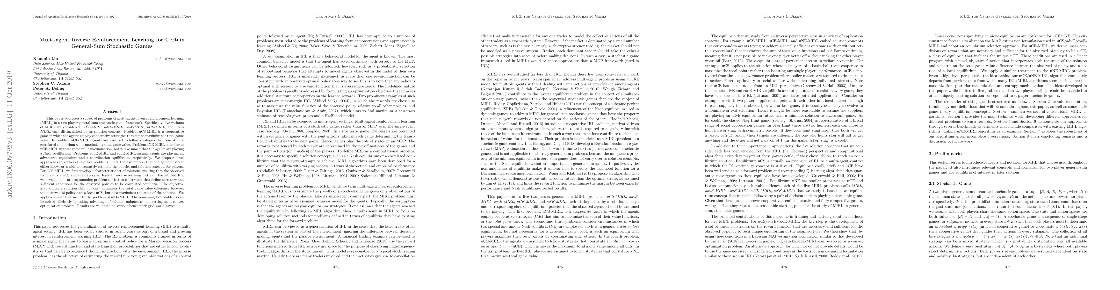 This paper develops novel approaches to multi-agent inverse reinforcement learning for various general-sum stochastic games, including cooperative, correlated, Nash, adversarial, and coordination equilibria, using a game observer who knows or can estimate policies and solution concepts.