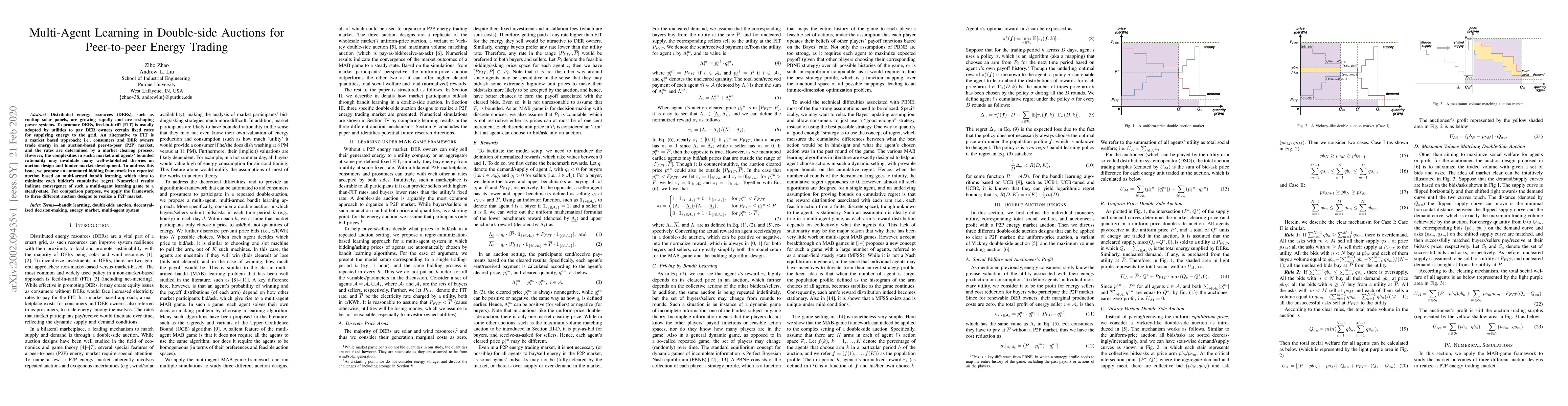 This paper proposes a multi-agent learning framework using multi-armed bandit algorithms for automated bidding in double-side auctions in peer-to-peer energy trading markets. The framework aims to minimize cumulative regret and demonstrates convergence in a repeated auction setting, applied to three different auction designs.