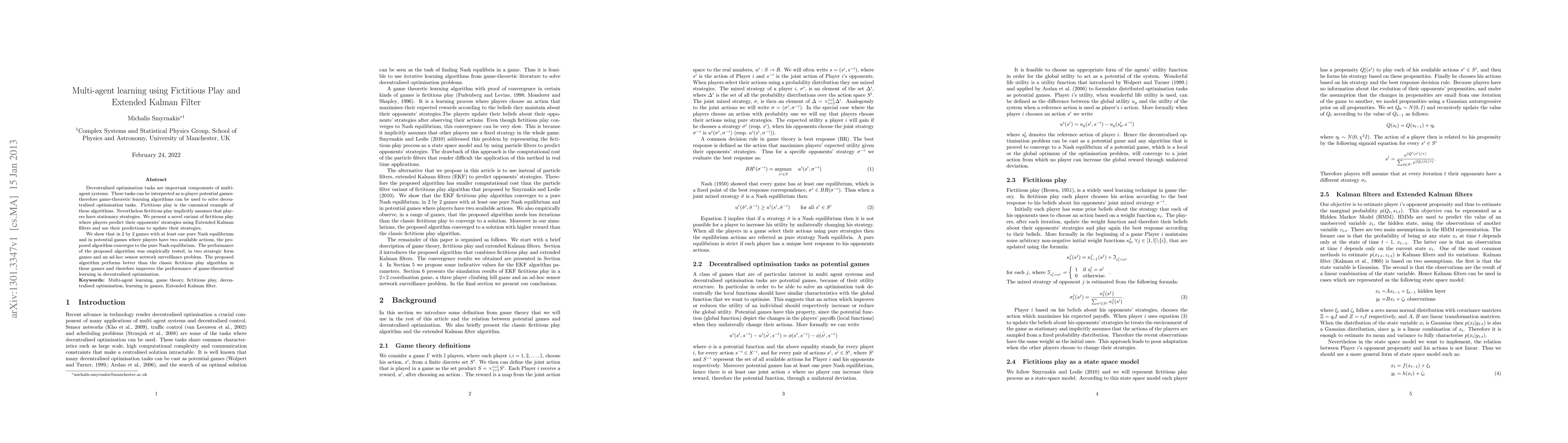 Decentralised optimisation tasks are important components of multi-agent systems. These tasks can be interpreted as n-player potential games: therefore game-theoretic learning algorithms can be used to solve decentralised optimisation tasks. Fictitious play is the canonical example of these algorithms. Nevertheless fictitious play implicitly assumes that players have stationary strategies. We present a novel variant of fictitious play where players predict their opponents' strategies using Extended Kalman filters and use their predictions to update their strategies. We show that in 2 by 2 games with at least one pure Nash equilibrium and in potential games where players have two available actions, the proposed algorithm converges to the pure Nash equilibrium. The performance of the proposed algorithm was empirically tested, in two strategic form games and an ad-hoc sensor network surveillance problem. The proposed algorithm performs better than the classic fictitious play algorithm in these games and therefore improves the performance of game-theoretical learning in decentralised optimisation.