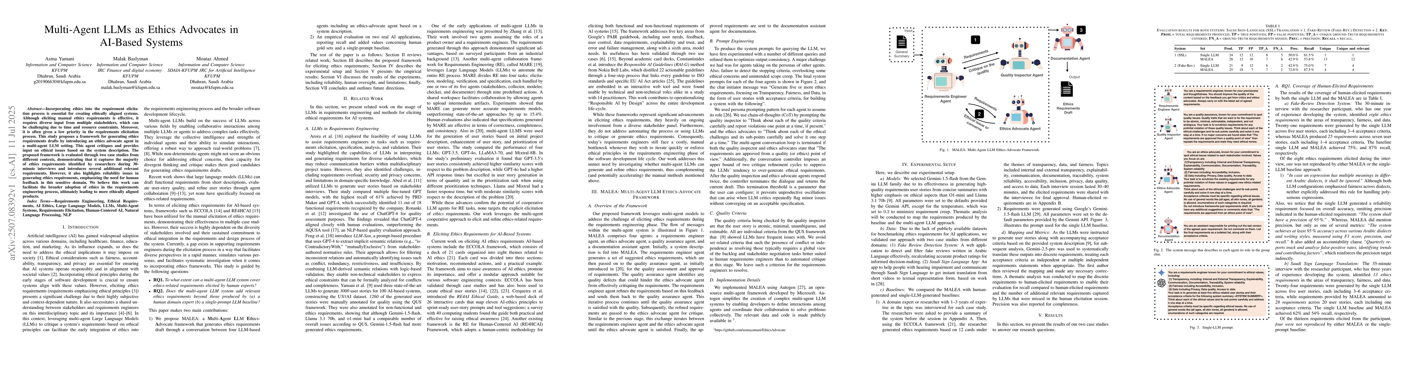 Incorporating ethics into the requirement elicitation process is essential for creating ethically aligned systems. Although eliciting manual ethics requirements is effective, it requires diverse input from multiple stakeholders, which can be challenging due to time and resource constraints. Moreover, it is often given a low priority in the requirements elicitation process. This study proposes a framework for generating ethics requirements drafts by introducing an ethics advocate agent in a multi-agent LLM setting. This agent critiques and provides input on ethical issues based on the system description. The proposed framework is evaluated through two case studies from different contexts, demonstrating that it captures the majority of ethics requirements identified by researchers during 30-minute interviews and introduces several additional relevant requirements. However, it also highlights reliability issues in generating ethics requirements, emphasizing the need for human feedback in this sensitive domain. We believe this work can facilitate the broader adoption of ethics in the requirements engineering process, ultimately leading to more ethically aligned products.