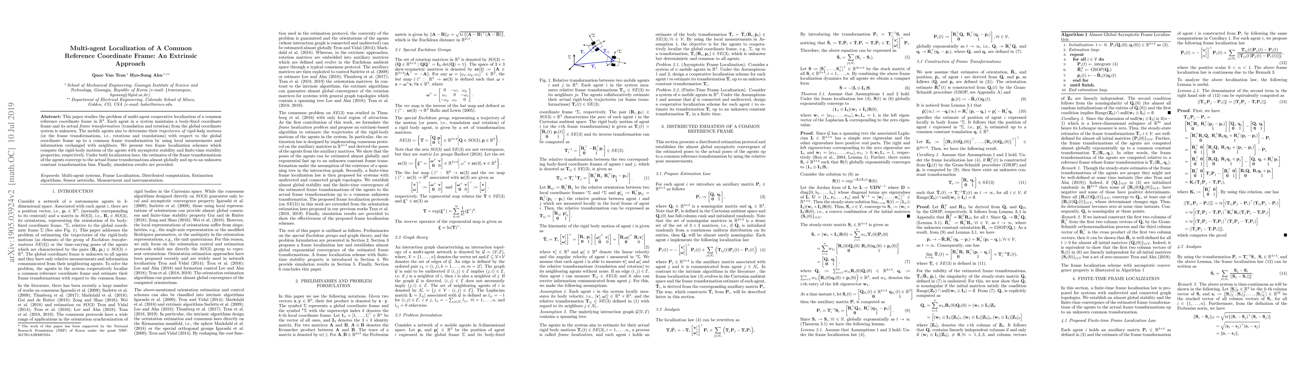 This paper studies the problem of multi-agent cooperative localization of a common reference coordinate frame in $\mathbb{R}^3$. Each agent in a system maintains a body-fixed coordinate frame and its actual \textit{frame transformation} (translation and rotation) from the global coordinate system is unknown. The mobile agents aim to determine their \textit{trajectories of rigid-body motions} (or the frame transformations, i.e., rotations and translations) with respect to the global coordinate frame up to a common frame transformation by using local measurements and information exchanged with neighbors. We present two frame localization schemes which compute the rigid-body motions of the agents with asymptotic stability and finite-time stability properties, respectively. Under both localization laws, the estimates of the frame transformations of the agents converge to the actual frame transformations almost globally and up to an unknown constant transformation bias. Finally, simulation results are provided.