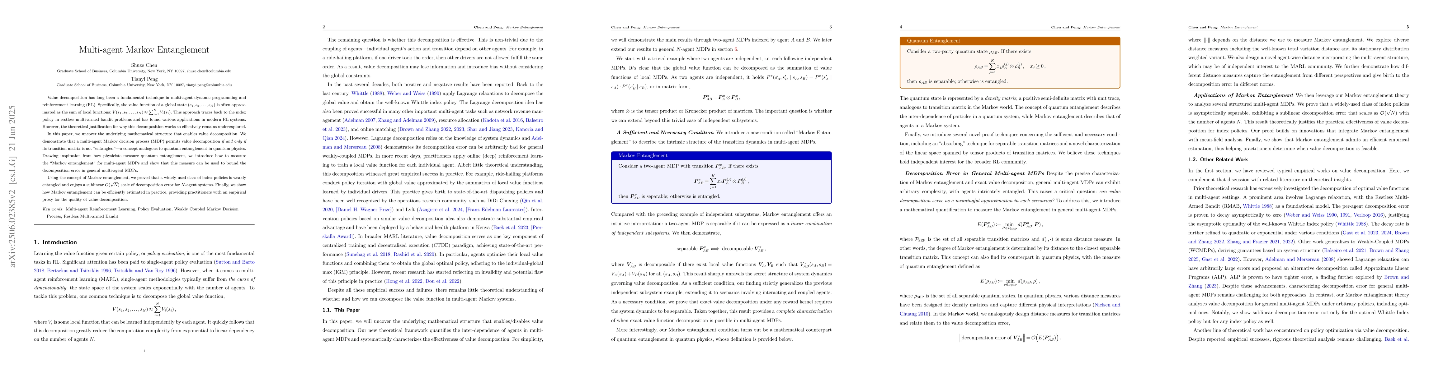 The paper introduces the concept of Markov entanglement to analyze the feasibility of value decomposition in multi-agent Markov decision processes (MDPs), drawing parallels with quantum entanglement measurement techniques.