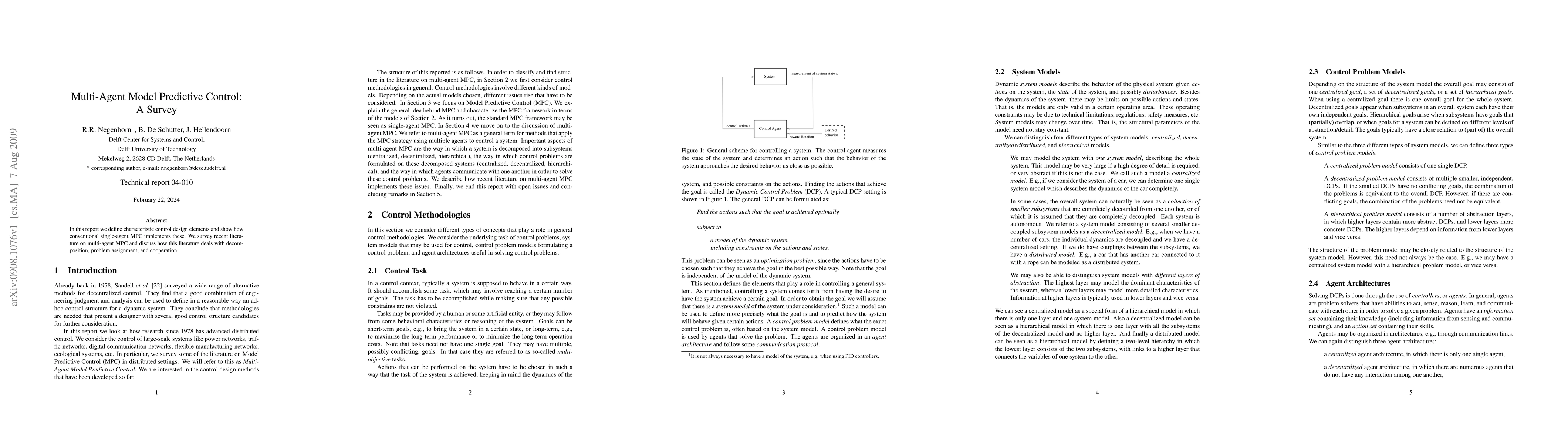 In this report we define characteristic control design elements and show how conventional single-agent MPC implements these. We survey recent literature on multi-agent MPC and discuss how this literature deals with decomposition, problem assignment, and cooperation.