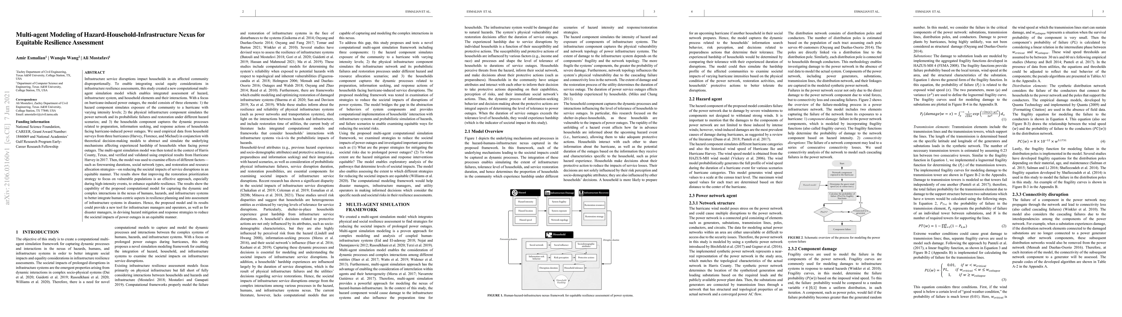 This study develops a multi-agent simulation model to assess the nexus of hazard, infrastructure, and households for equitable resilience. The model simulates hurricane exposure, power network failures, and household responses to power outages, and was tested in Harris County, Texas, using data from Hurricane Harvey. The results indicate that prioritizing restoration for vulnerable populations can significantly reduce societal impacts during high-intensity events.