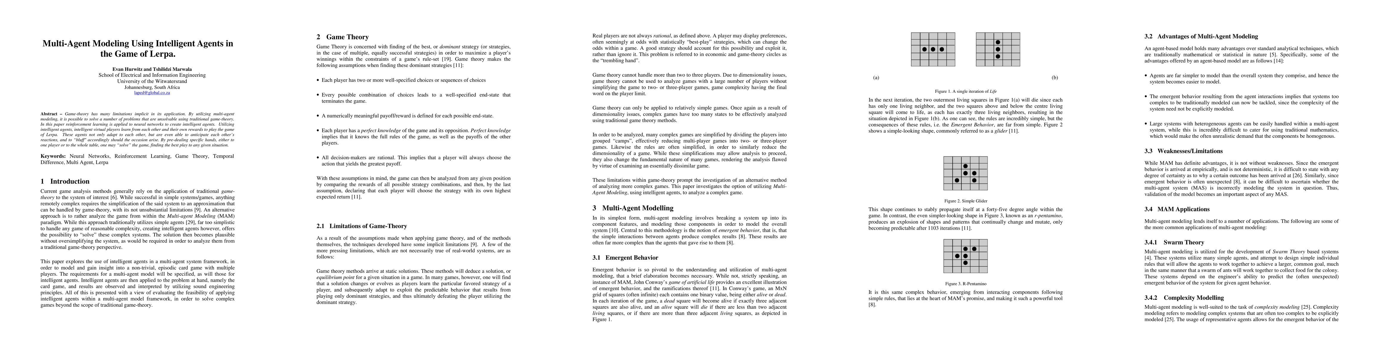 Game theory has many limitations implicit in its application. By utilizing multiagent modeling, it is possible to solve a number of problems that are unsolvable using traditional game theory. In this paper reinforcement learning is applied to neural networks to create intelligent agents