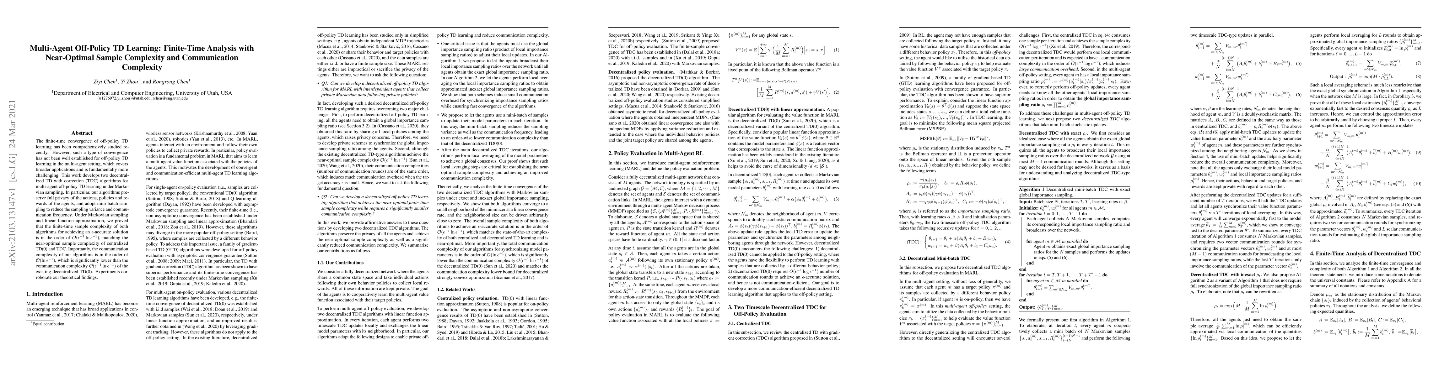 This paper introduces two decentralized TD with correction (TDC) algorithms for multi-agent off-policy TD learning, achieving near-optimal sample complexity of $\mathcal{O}(\epsilon^{-1}\ln \epsilon^{-1})$ and significantly lower communication complexity of $\mathcal{O}(\ln \epsilon^{-1})$. The algorithms maintain agent privacy and use mini-batch sampling to reduce variance and communication frequency.