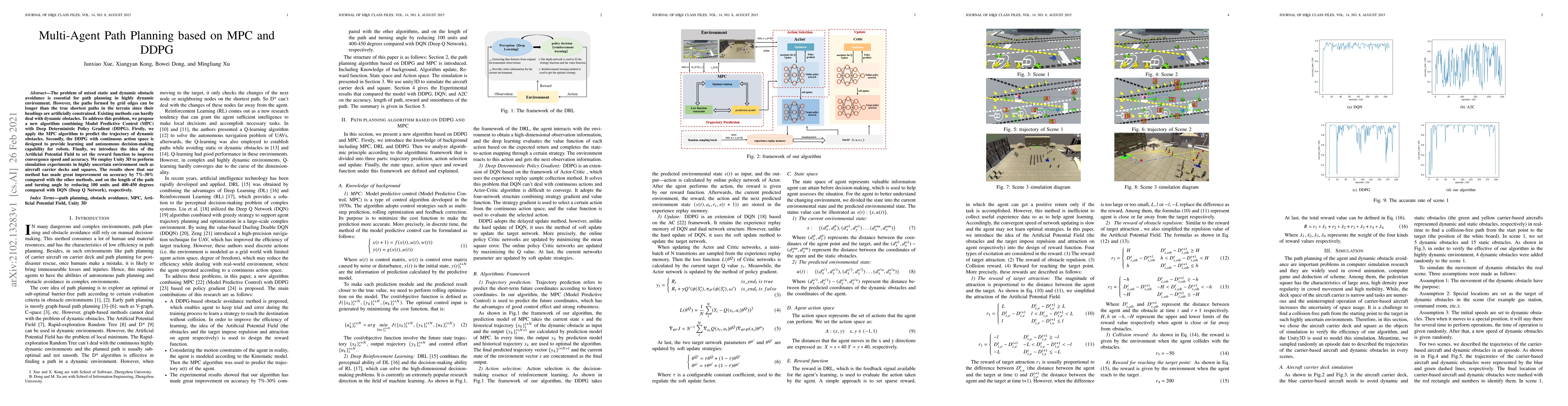 The problem of mixed static and dynamic obstacle avoidance is essential for path planning in highly dynamic environment. However, the paths formed by grid edges can be longer than the true shortest paths in the terrain since their headings are artificially constrained. Existing methods can hardly deal with dynamic obstacles. To address this problem, we propose a new algorithm combining Model Predictive Control (MPC) with Deep Deterministic Policy Gradient (DDPG). Firstly, we apply the MPC algorithm to predict the trajectory of dynamic obstacles. Secondly, the DDPG with continuous action space is designed to provide learning and autonomous decision-making capability for robots. Finally, we introduce the idea of the Artificial Potential Field to set the reward function to improve convergence speed and accuracy. We employ Unity 3D to perform simulation experiments in highly uncertain environment such as aircraft carrier decks and squares. The results show that our method has made great improvement on accuracy by 7%-30% compared with the other methods, and on the length of the path and turning angle by reducing 100 units and 400-450 degrees compared with DQN (Deep Q Network), respectively.