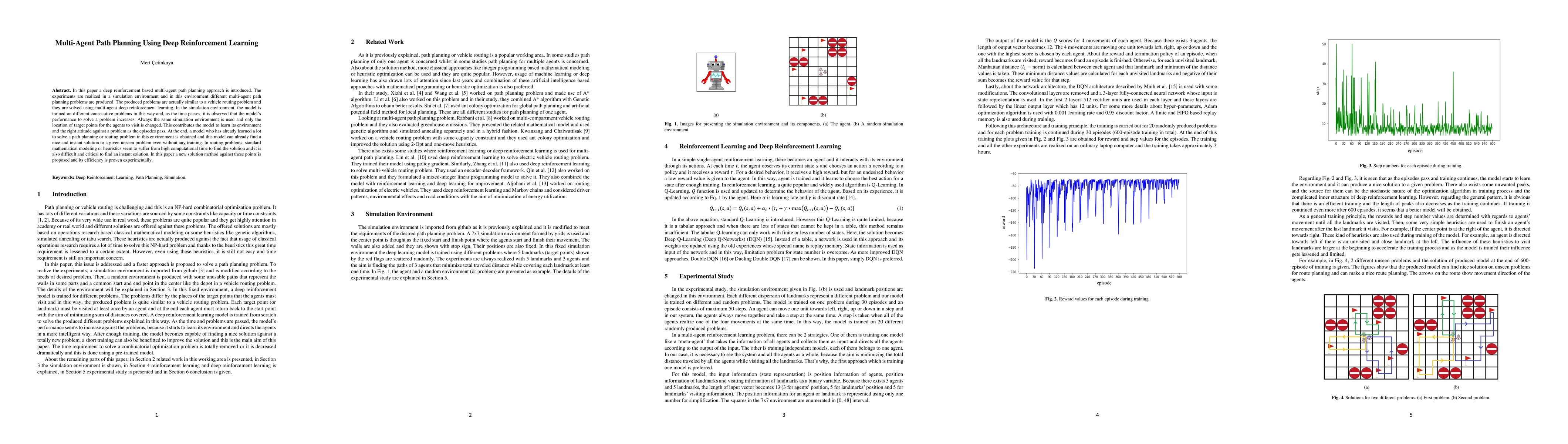 This paper introduces a deep reinforcement learning method for multi-agent path planning, trained in a simulation environment. The model's performance improves over time, leading to efficient solutions for unseen routing problems without additional training, addressing high computational challenges of traditional methods.