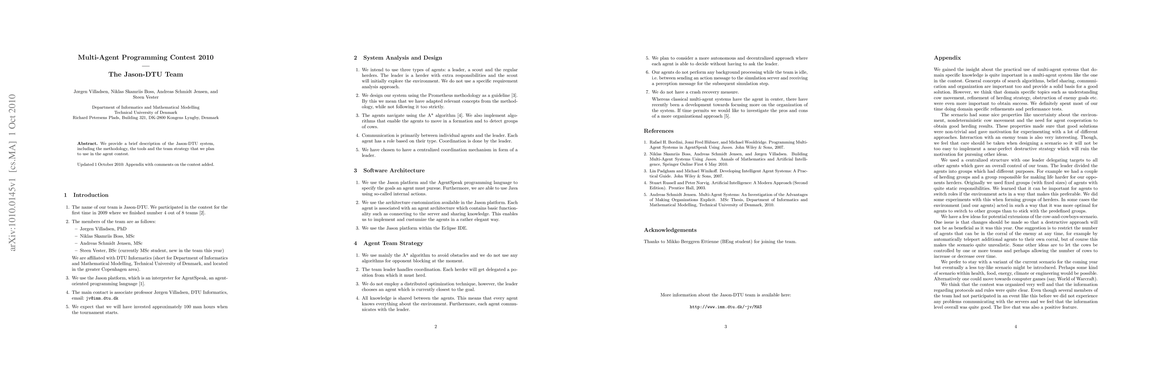 We provide a brief description of the Jason-DTU system, including the methodology, the tools and the team strategy that we plan to use in the agent contest.