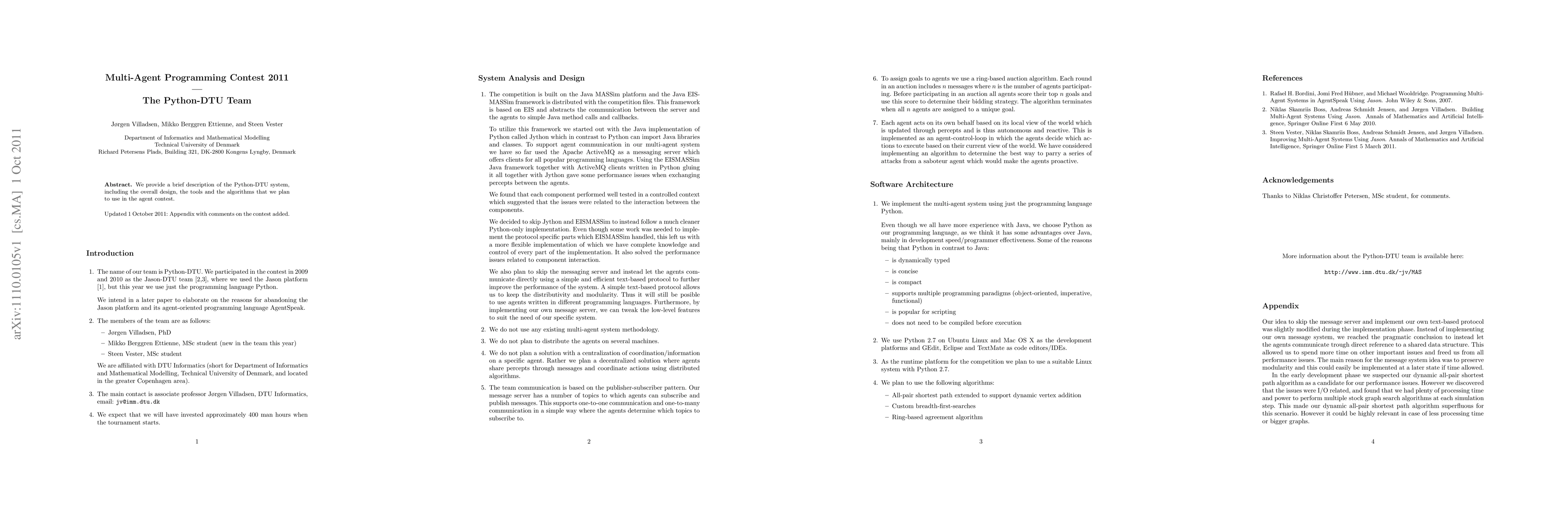 We provide a brief description of the Python-DTU system, including the overall design, the tools and the algorithms that we plan to use in the agent contest.