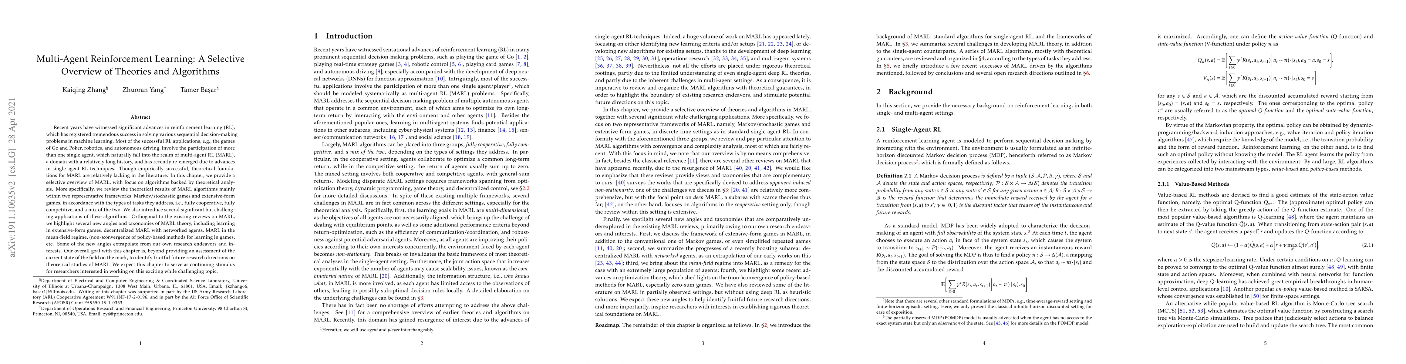 Recent years have witnessed significant advances in reinforcement learning (RL), which has registered great success in solving various sequential decision-making problems in machine learning. Most of the successful RL applications, e.g., the games of Go and Poker, robotics, and autonomous driving, involve the participation of more than one single agent, which naturally fall into the realm of multi-agent RL (MARL), a domain with a relatively long history, and has recently re-emerged due to advances in single-agent RL techniques. Though empirically successful, theoretical foundations for MARL are relatively lacking in the literature. In this chapter, we provide a selective overview of MARL, with focus on algorithms backed by theoretical analysis. More specifically, we review the theoretical results of MARL algorithms mainly within two representative frameworks, Markov/stochastic games and extensive-form games, in accordance with the types of tasks they address, i.e., fully cooperative, fully competitive, and a mix of the two. We also introduce several significant but challenging applications of these algorithms. Orthogonal to the existing reviews on MARL, we highlight several new angles and taxonomies of MARL theory, including learning in extensive-form games, decentralized MARL with networked agents, MARL in the mean-field regime, (non-)convergence of policy-based methods for learning in games, etc. Some of the new angles extrapolate from our own research endeavors and interests. Our overall goal with this chapter is, beyond providing an assessment of the current state of the field on the mark, to identify fruitful future research directions on theoretical studies of MARL. We expect this chapter to serve as continuing stimulus for researchers interested in working on this exciting while challenging topic.