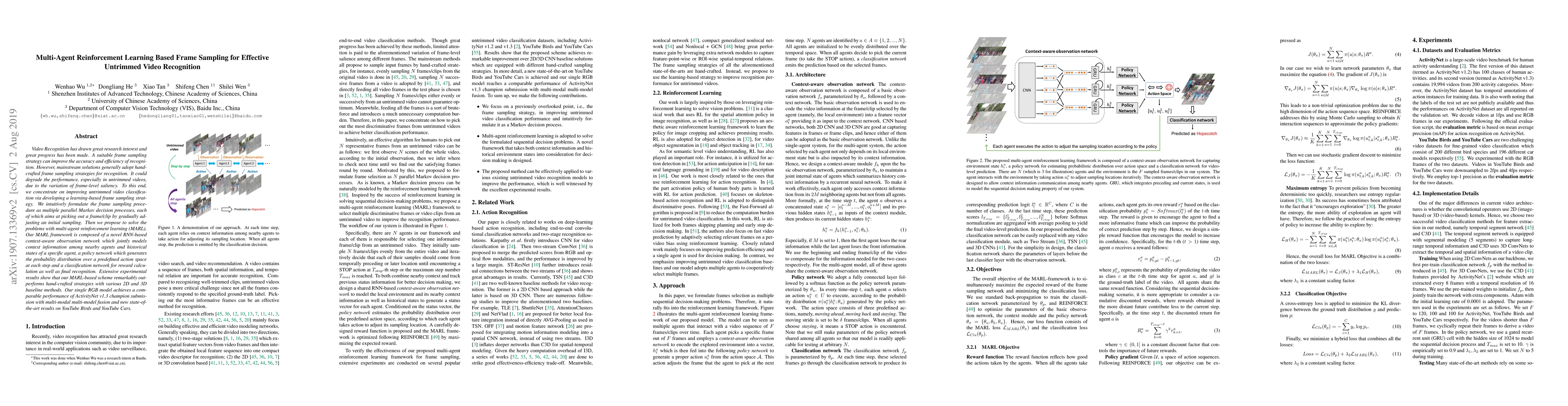 Video Recognition has drawn great research interest and great progress has been made. A suitable frame sampling strategy can improve the accuracy and efficiency of recognition. However, mainstream solutions generally adopt hand-crafted frame sampling strategies for recognition. It could degrade the performance, especially in untrimmed videos, due to the variation of frame-level saliency. To this end, we concentrate on improving untrimmed video classification via developing a learning-based frame sampling strategy. We intuitively formulate the frame sampling procedure as multiple parallel Markov decision processes, each of which aims at picking out a frame/clip by gradually adjusting an initial sampling. Then we propose to solve the problems with multi-agent reinforcement learning (MARL). Our MARL framework is composed of a novel RNN-based context-aware observation network which jointly models context information among nearby agents and historical states of a specific agent, a policy network which generates the probability distribution over a predefined action space at each step and a classification network for reward calculation as well as final recognition. Extensive experimental results show that our MARL-based scheme remarkably outperforms hand-crafted strategies with various 2D and 3D baseline methods. Our single RGB model achieves a comparable performance of ActivityNet v1.3 champion submission with multi-modal multi-model fusion and new state-of-the-art results on YouTube Birds and YouTube Cars.