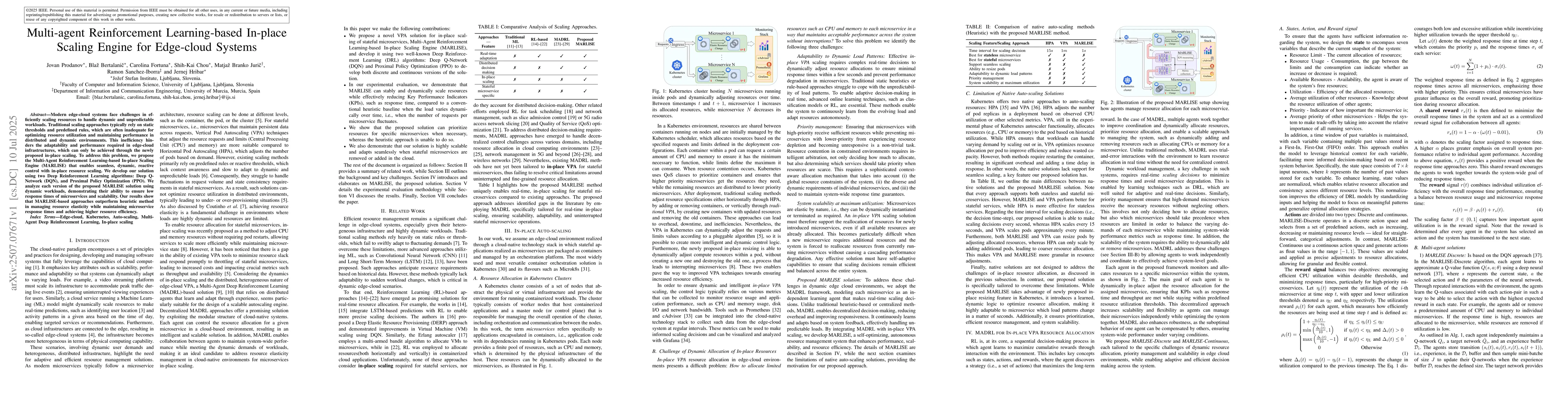 Modern edge-cloud systems face challenges in efficiently scaling resources to handle dynamic and unpredictable workloads. Traditional scaling approaches typically rely on static thresholds and predefined rules, which are often inadequate for optimizing resource utilization and maintaining performance in distributed and dynamic environments. This inefficiency hinders the adaptability and performance required in edge-cloud infrastructures, which can only be achieved through the newly proposed in-place scaling. To address this problem, we propose the Multi-Agent Reinforcement Learning-based In-place Scaling Engine (MARLISE) that enables seamless, dynamic, reactive control with in-place resource scaling. We develop our solution using two Deep Reinforcement Learning algorithms: Deep Q-Network (DQN), and Proximal Policy Optimization (PPO). We analyze each version of the proposed MARLISE solution using dynamic workloads, demonstrating their ability to ensure low response times of microservices and scalability. Our results show that MARLISE-based approaches outperform heuristic method in managing resource elasticity while maintaining microservice response times and achieving higher resource efficiency.