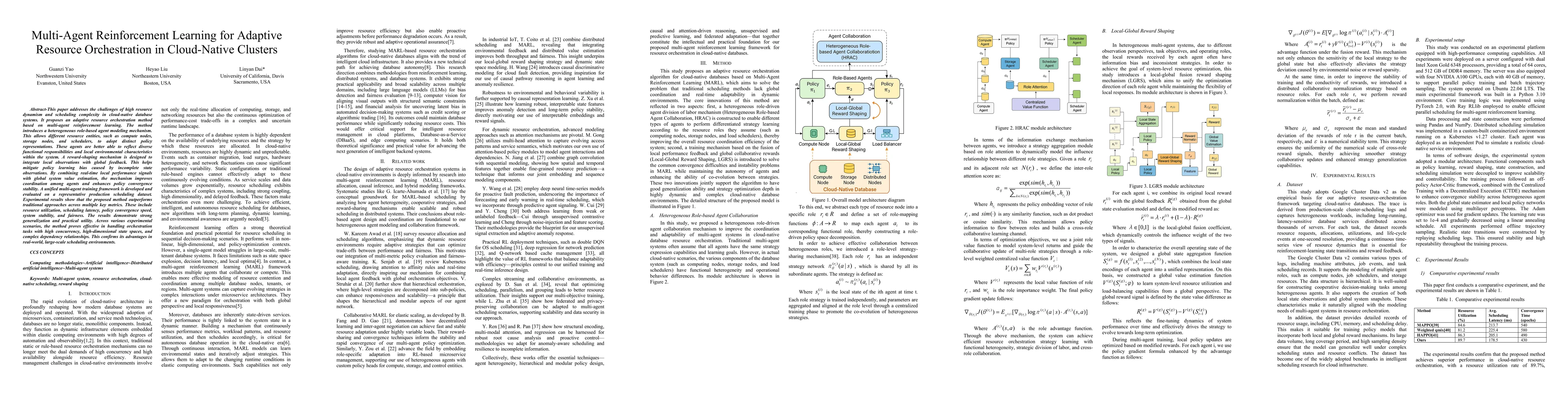 This paper addresses the challenges of high resource dynamism and scheduling complexity in cloud-native database systems. It proposes an adaptive resource orchestration method based on multi-agent reinforcement learning. The method introduces a heterogeneous role-based agent modeling mechanism. This allows different resource entities, such as compute nodes, storage nodes, and schedulers, to adopt distinct policy representations. These agents are better able to reflect diverse functional responsibilities and local environmental characteristics within the system. A reward-shaping mechanism is designed to integrate local observations with global feedback. This helps mitigate policy learning bias caused by incomplete state observations. By combining real-time local performance signals with global system value estimation, the mechanism improves coordination among agents and enhances policy convergence stability. A unified multi-agent training framework is developed and evaluated on a representative production scheduling dataset. Experimental results show that the proposed method outperforms traditional approaches across multiple key metrics. These include resource utilization, scheduling latency, policy convergence speed, system stability, and fairness. The results demonstrate strong generalization and practical utility. Across various experimental scenarios, the method proves effective in handling orchestration tasks with high concurrency, high-dimensional state spaces, and complex dependency relationships. This confirms its advantages in real-world, large-scale scheduling environments.