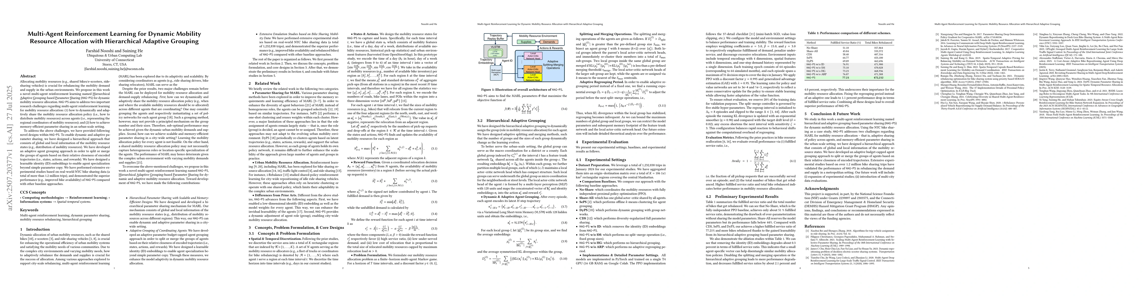 Allocating mobility resources (e.g., shared bikes/e-scooters, ride-sharing vehicles) is crucial for rebalancing the mobility demand and supply in the urban environments. We propose in this work a novel multi-agent reinforcement learning named Hierarchical Adaptive Grouping-based Parameter Sharing (HAG-PS) for dynamic mobility resource allocation. HAG-PS aims to address two important research challenges regarding multi-agent reinforcement learning for mobility resource allocation: (1) how to dynamically and adaptively share the mobility resource allocation policy (i.e., how to distribute mobility resources) across agents (i.e., representing the regional coordinators of mobility resources); and (2) how to achieve memory-efficient parameter sharing in an urban-scale setting. To address the above challenges, we have provided following novel designs within HAG-PS. To enable dynamic and adaptive parameter sharing, we have designed a hierarchical approach that consists of global and local information of the mobility resource states (e.g., distribution of mobility resources). We have developed an adaptive agent grouping approach in order to split or merge the groups of agents based on their relative closeness of encoded trajectories (i.e., states, actions, and rewards). We have designed a learnable identity (ID) embeddings to enable agent specialization beyond simple parameter copy. We have performed extensive experimental studies based on real-world NYC bike sharing data (a total of more than 1.2 million trips), and demonstrated the superior performance (e.g., improved bike availability) of HAG-PS compared with other baseline approaches.