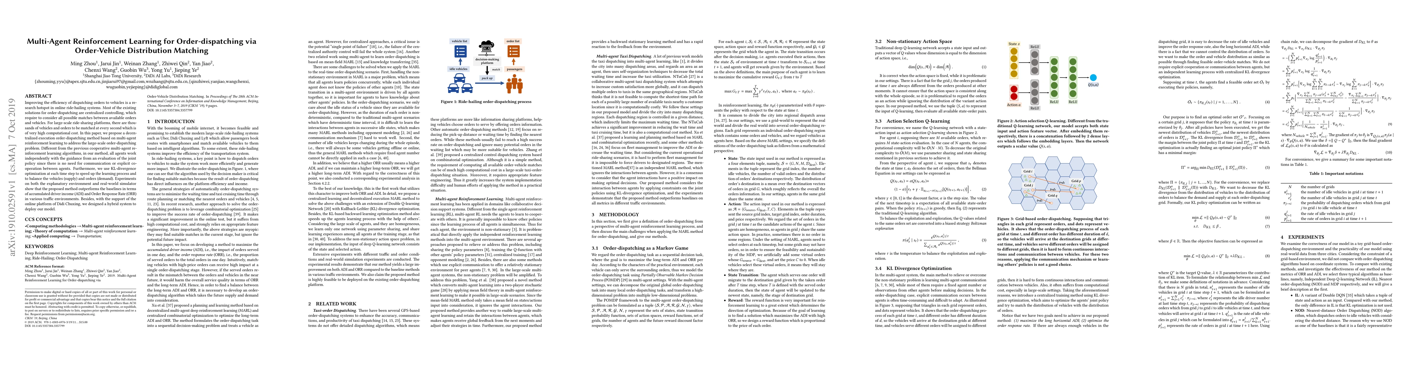 Improving the efficiency of dispatching orders to vehicles is a research hotspot in online ride-hailing systems. Most of the existing solutions for order-dispatching are centralized controlling, which require to consider all possible matches between available orders and vehicles. For large-scale ride-sharing platforms, there are thousands of vehicles and orders to be matched at every second which is of very high computational cost. In this paper, we propose a decentralized execution order-dispatching method based on multi-agent reinforcement learning to address the large-scale order-dispatching problem. Different from the previous cooperative multi-agent reinforcement learning algorithms, in our method, all agents work independently with the guidance from an evaluation of the joint policy since there is no need for communication or explicit cooperation between agents. Furthermore, we use KL-divergence optimization at each time step to speed up the learning process and to balance the vehicles (supply) and orders (demand). Experiments on both the explanatory environment and real-world simulator show that the proposed method outperforms the baselines in terms of accumulated driver income (ADI) and Order Response Rate (ORR) in various traffic environments. Besides, with the support of the online platform of Didi Chuxing, we designed a hybrid system to deploy our model.