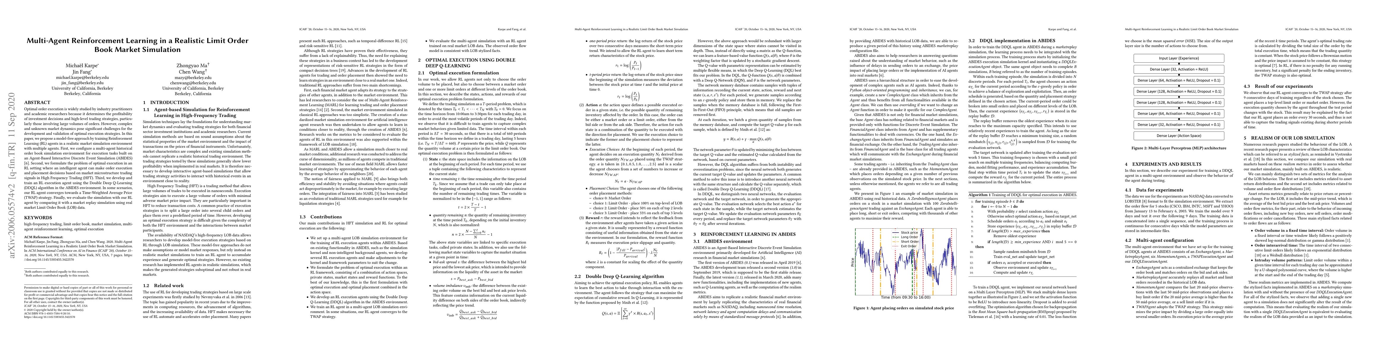Optimal order execution is widely studied by industry practitioners and academic researchers because it determines the profitability of investment decisions and high-level trading strategies, particularly those involving large volumes of orders. However, complex and unknown market dynamics pose significant challenges for the development and validation of optimal execution strategies. In this paper, we propose a model-free approach by training Reinforcement Learning (RL) agents in a realistic market simulation environment with multiple agents. First, we configure a multi-agent historical order book simulation environment for execution tasks built on an Agent-Based Interactive Discrete Event Simulation (ABIDES) [arXiv:1904.12066]. Second, we formulate the problem of optimal execution in an RL setting where an intelligent agent can make order execution and placement decisions based on market microstructure trading signals in High Frequency Trading (HFT). Third, we develop and train an RL execution agent using the Double Deep Q-Learning (DDQL) algorithm in the ABIDES environment. In some scenarios, our RL agent converges towards a Time-Weighted Average Price (TWAP) strategy. Finally, we evaluate the simulation with our RL agent by comparing it with a market replay simulation using real market Limit Order Book (LOB) data.