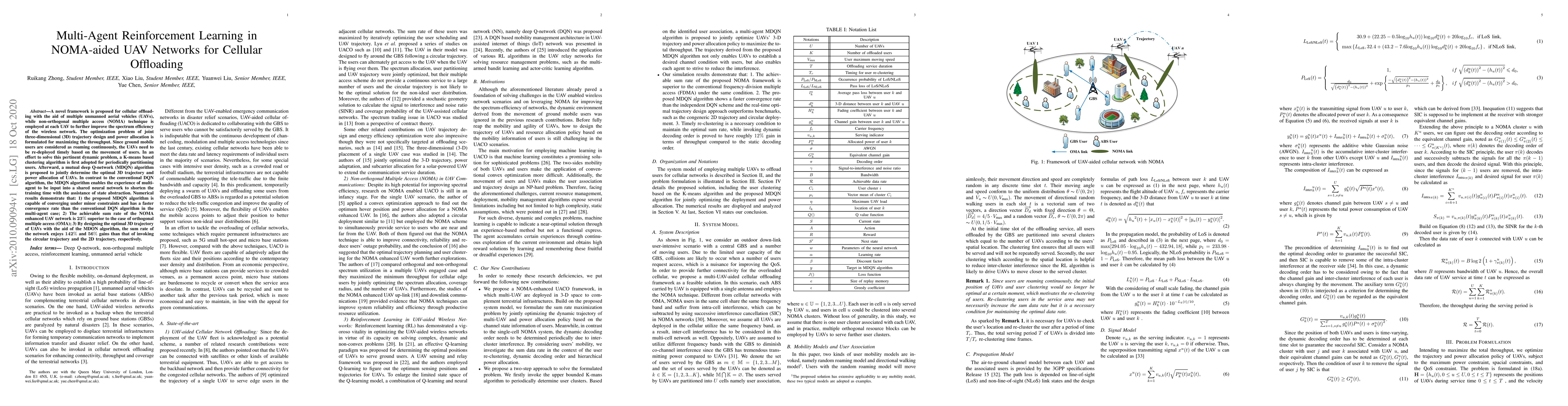 This paper proposes a framework for cellular offloading using multiple UAVs with NOMA to enhance spectrum efficiency. It formulates an optimization problem for 3D trajectory design and power allocation, solved using an MDQN algorithm that outperforms conventional DQN in multi-agent scenarios, achieving a 23% higher sum rate compared to OMA.