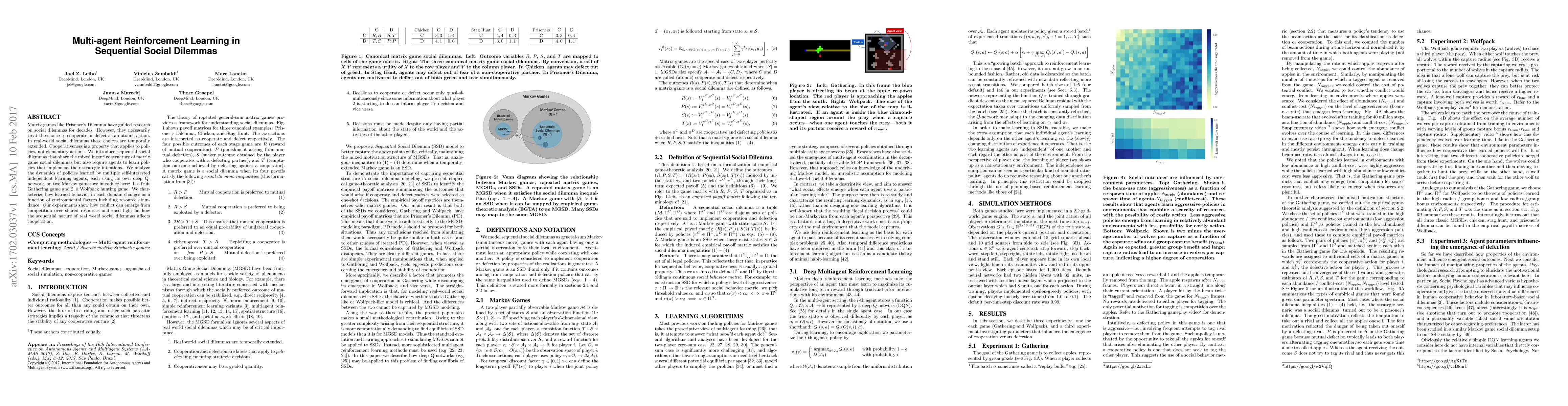 This paper explores multi-agent reinforcement learning in sequential social dilemmas, introducing two Markov games to study how agents learn cooperative policies over time. It examines how environmental factors like resource abundance influence learned behavior and conflict dynamics, providing insights into real-world cooperation challenges.