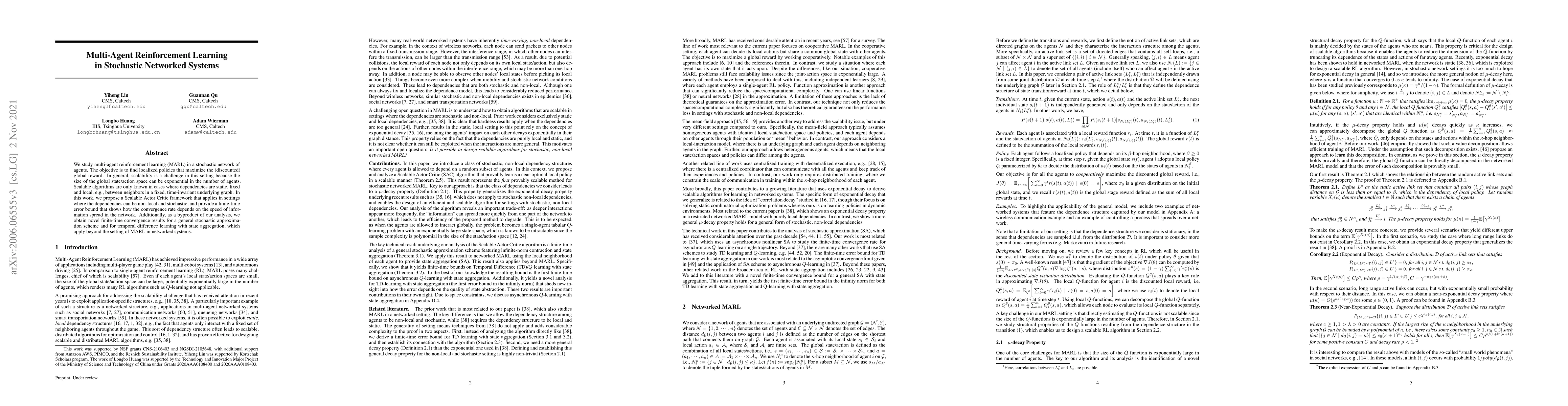 Researchers propose a scalable framework for multi-agent reinforcement learning in stochastic networked systems, enabling convergence in non-local and dynamic settings. The work provides novel finite-time error bounds and applies beyond the MARL setting in networked systems.