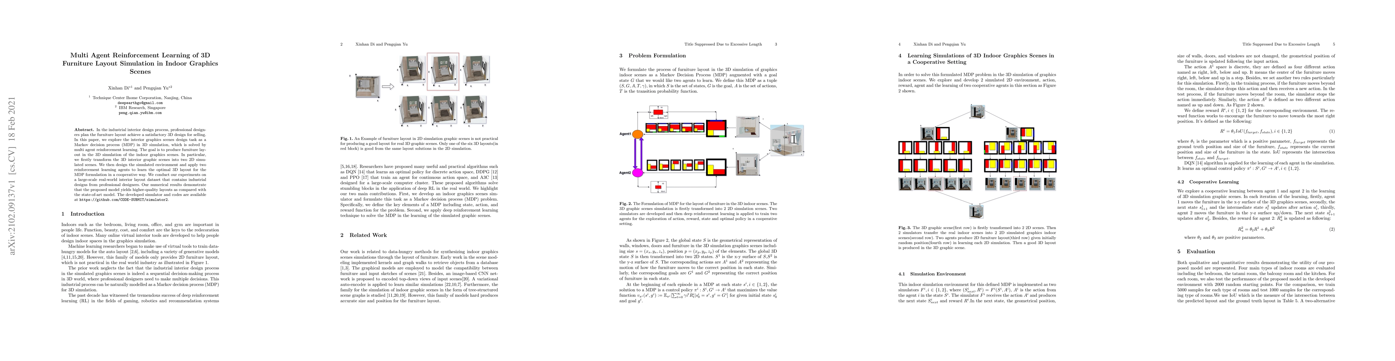 This paper proposes a multi-agent reinforcement learning approach to optimize 3D furniture layout in indoor graphics scenes, transforming 3D designs into 2D simulations. The method outperforms existing models, as demonstrated on a large-scale industrial design dataset, and the simulator and codes are publicly available.
