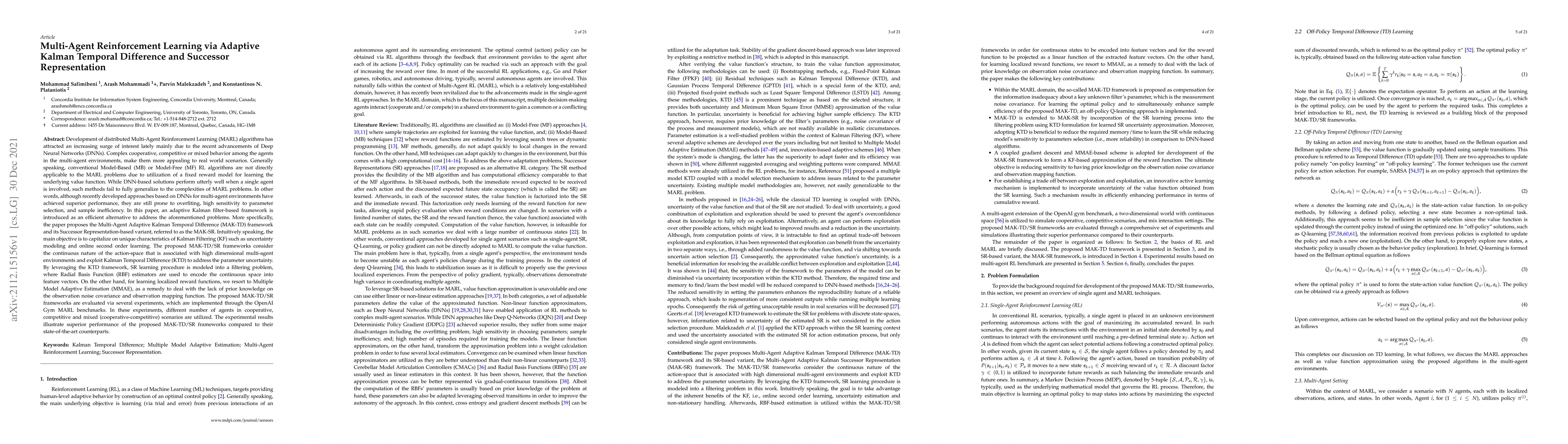 Distributed Multi-Agent Reinforcement Learning (MARL) algorithms has attracted a surge of interest lately mainly due to the recent advancements of Deep Neural Networks (DNNs). Conventional Model-Based (MB) or Model-Free (MF) RL algorithms are not directly applicable to the MARL problems due to utilization of a fixed reward model for learning the underlying value function. While DNN-based solutions perform utterly well when a single agent is involved, such methods fail to fully generalize to the complexities of MARL problems. In other words, although recently developed approaches based on DNNs for multi-agent environments have achieved superior performance, they are still prone to overfiting, high sensitivity to parameter selection, and sample inefficiency. The paper proposes the Multi-Agent Adaptive Kalman Temporal Difference (MAK-TD) framework and its Successor Representation-based variant, referred to as the MAK-SR. Intuitively speaking, the main objective is to capitalize on unique characteristics of Kalman Filtering (KF) such as uncertainty modeling and online second order learning. The proposed MAK-TD/SR frameworks consider the continuous nature of the action-space that is associated with high dimensional multi-agent environments and exploit Kalman Temporal Difference (KTD) to address the parameter uncertainty. By leveraging the KTD framework, SR learning procedure is modeled into a filtering problem, where Radial Basis Function (RBF) estimators are used to encode the continuous space into feature vectors. On the other hand, for learning localized reward functions, we resort to Multiple Model Adaptive Estimation (MMAE), to deal with the lack of prior knowledge on the observation noise covariance and observation mapping function. The proposed MAK-TD/SR frameworks are evaluated via several experiments, which are implemented through the OpenAI Gym MARL benchmarks.