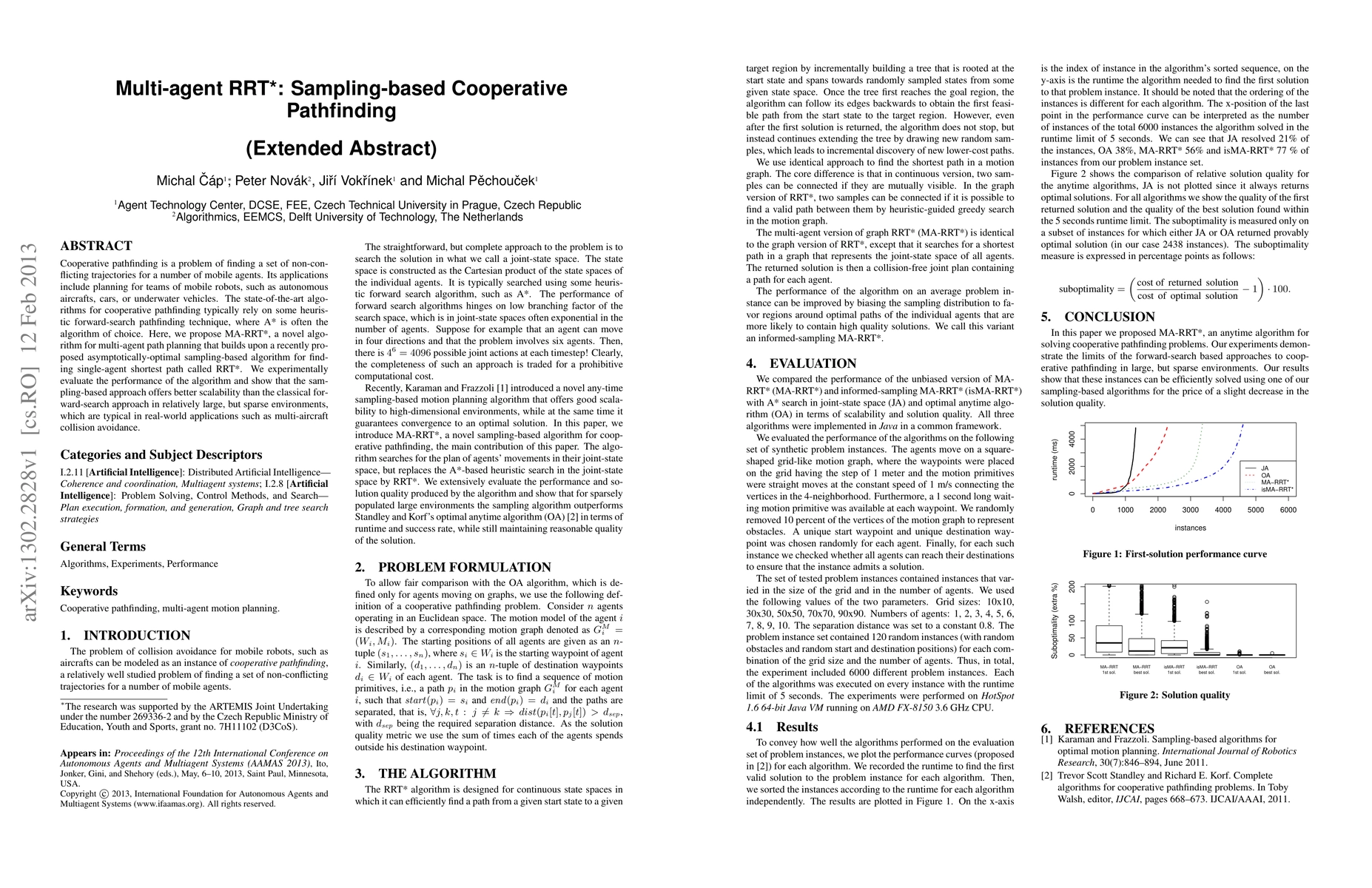 Cooperative pathfinding is a problem of finding a set of non-conflicting trajectories for a number of mobile agents. Its applications include planning for teams of mobile robots, such as autonomous aircrafts, cars, or underwater vehicles. The state-of-the-art algorithms for cooperative pathfinding typically rely on some heuristic forward-search pathfinding technique, where A* is often the algorithm of choice. Here, we propose MA-RRT*, a novel algorithm for multi-agent path planning that builds upon a recently proposed asymptotically-optimal sampling-based algorithm for finding single-agent shortest path called RRT*. We experimentally evaluate the performance of the algorithm and show that the sampling-based approach offers better scalability than the classical forward-search approach in relatively large, but sparse environments, which are typical in real-world applications such as multi-aircraft collision avoidance.