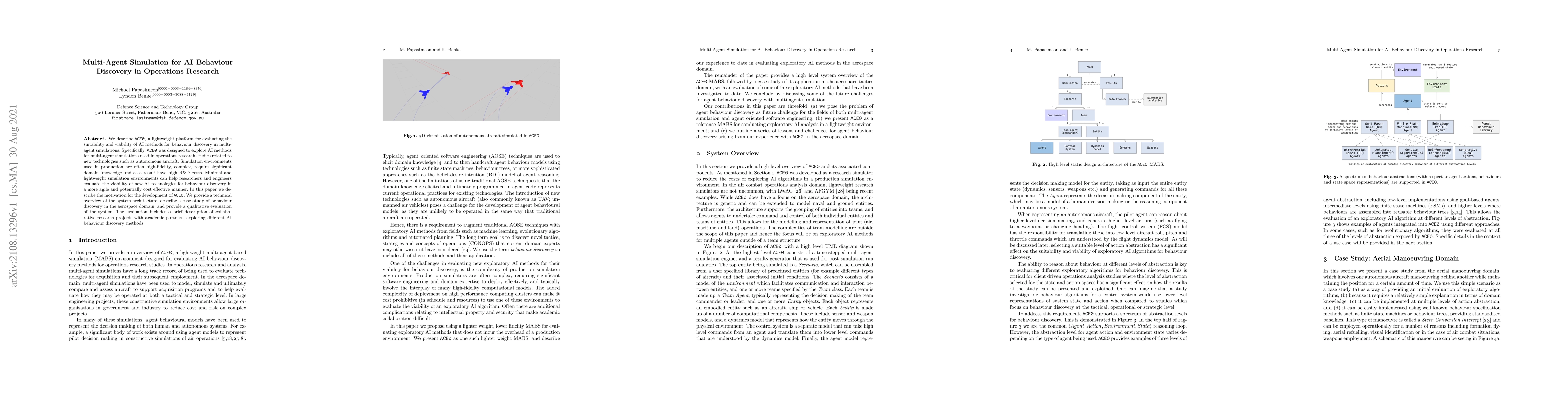 This paper introduces ACE0, a lightweight platform for evaluating AI methods in multi-agent simulations, particularly for operations research in new technologies like autonomous aircraft. The platform aims to provide a cost-effective and agile way to assess AI behaviour discovery, offering a technical overview and a case study in the aerospace domain.